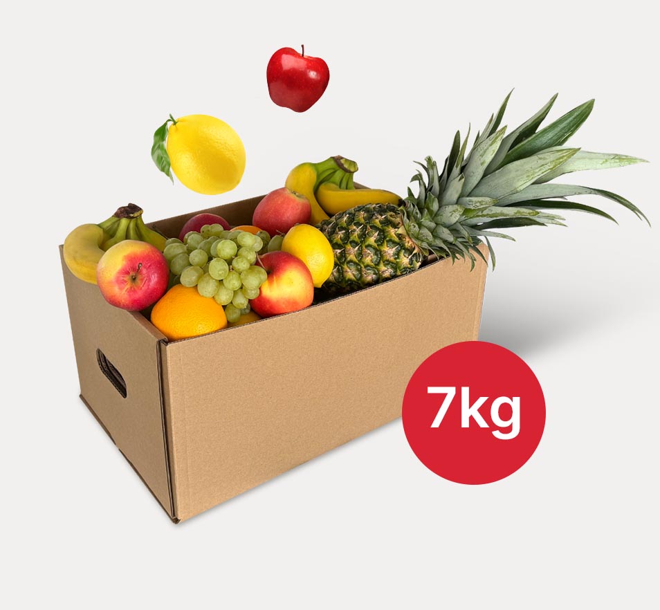 **Augļu kastē (7kg) iekļauti - banāni, ananass, apelsīni, citroni, āboli, bumbieri un vīnogas.
