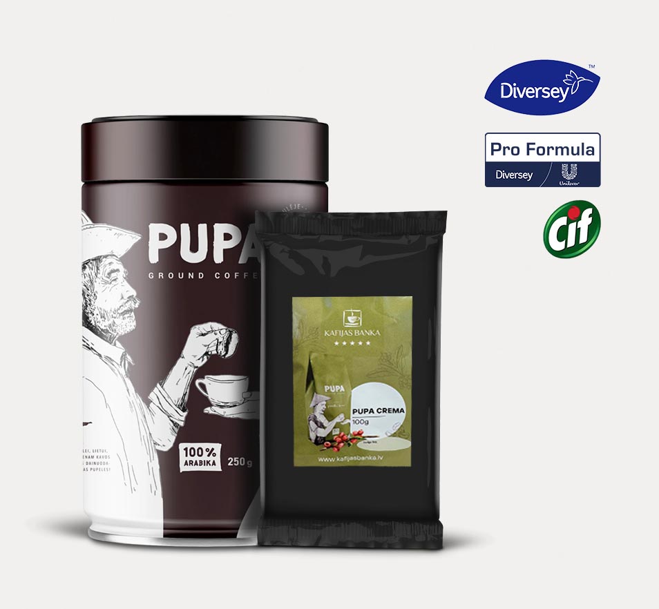 No 02.01.2025. līdz 31.01.2025. iegādājies CIF Professional un Diversey produktus vismaz EUR 35 bez PVN vērtībā un saņem kafijas komplektu "Pupa" dāvanā!*