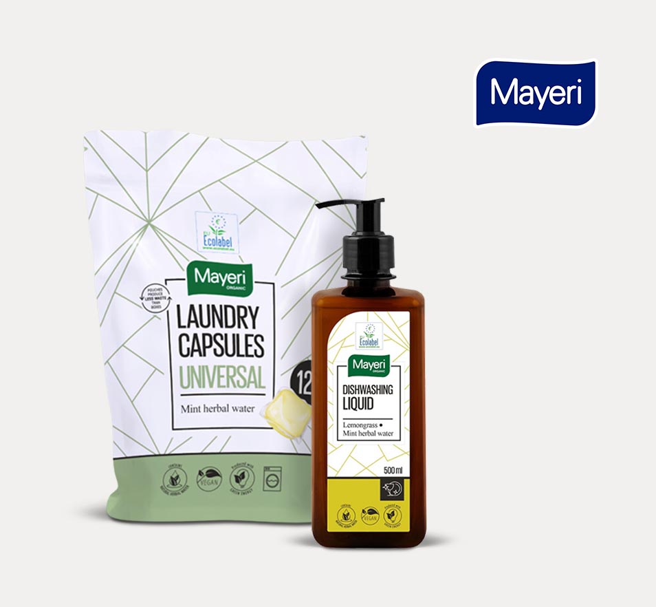 *Komplektā ietilpst: “Mayeri” Organic trauku mazgāšanas līdzeklis Citronzāle (500ml) un “Mayeri” Organic Universal veļas mazgāšanas kapsulas (12 gab).