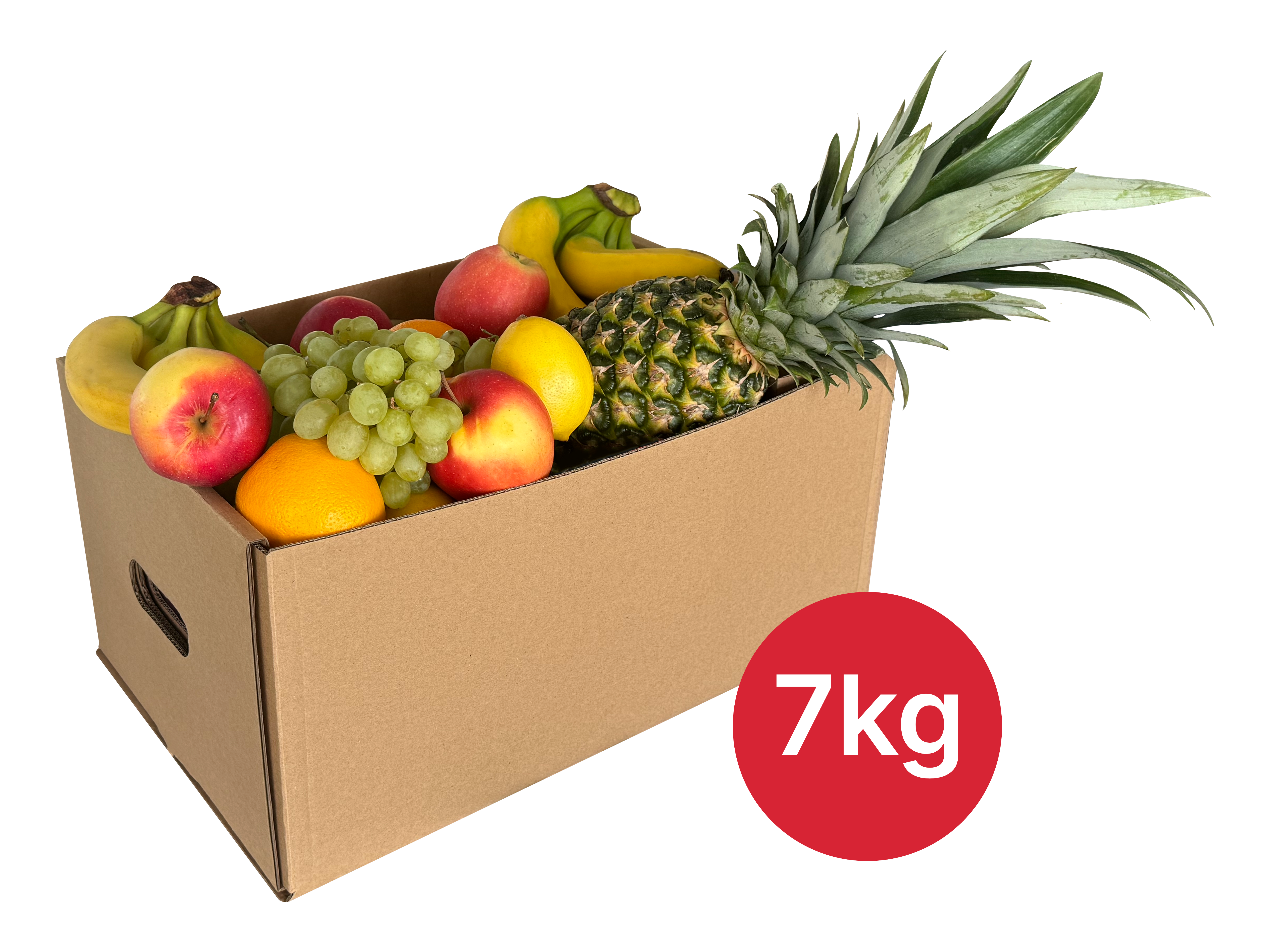 **Augļu kastē (7kg) iekļauti - banāni, ananass, apelsīni, citroni, āboli, bumbieri un vīnogas.