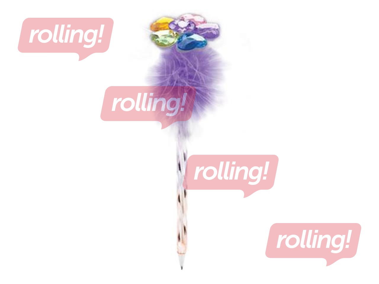 Lodīšu pildspalva ar violetām spalvām un ziedu.