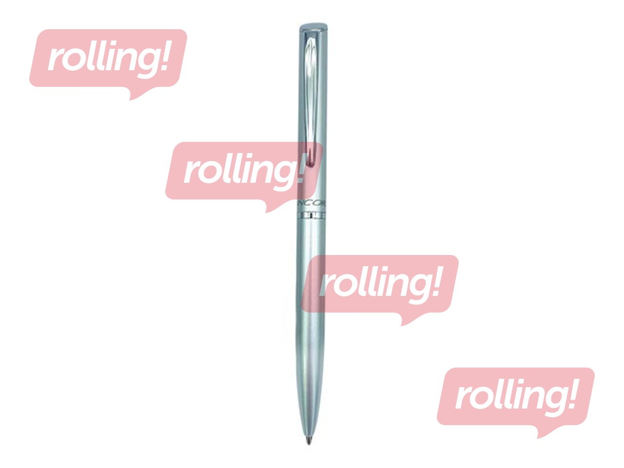 Metāla lodīšu pildspalva, pagriežama, sudraba krāsā. Iesaiņota melnā kastītē ar sudraba vāciņu.