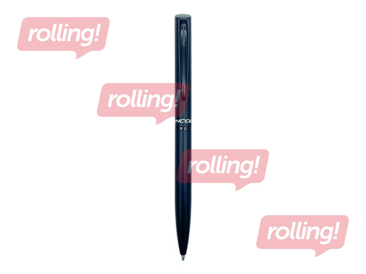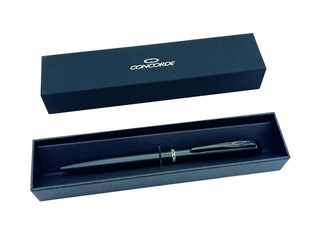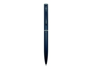 Metāla lodīšu pildspalva, pagriežama, melnā krāsā. Iesaiņota melnā kastītē.