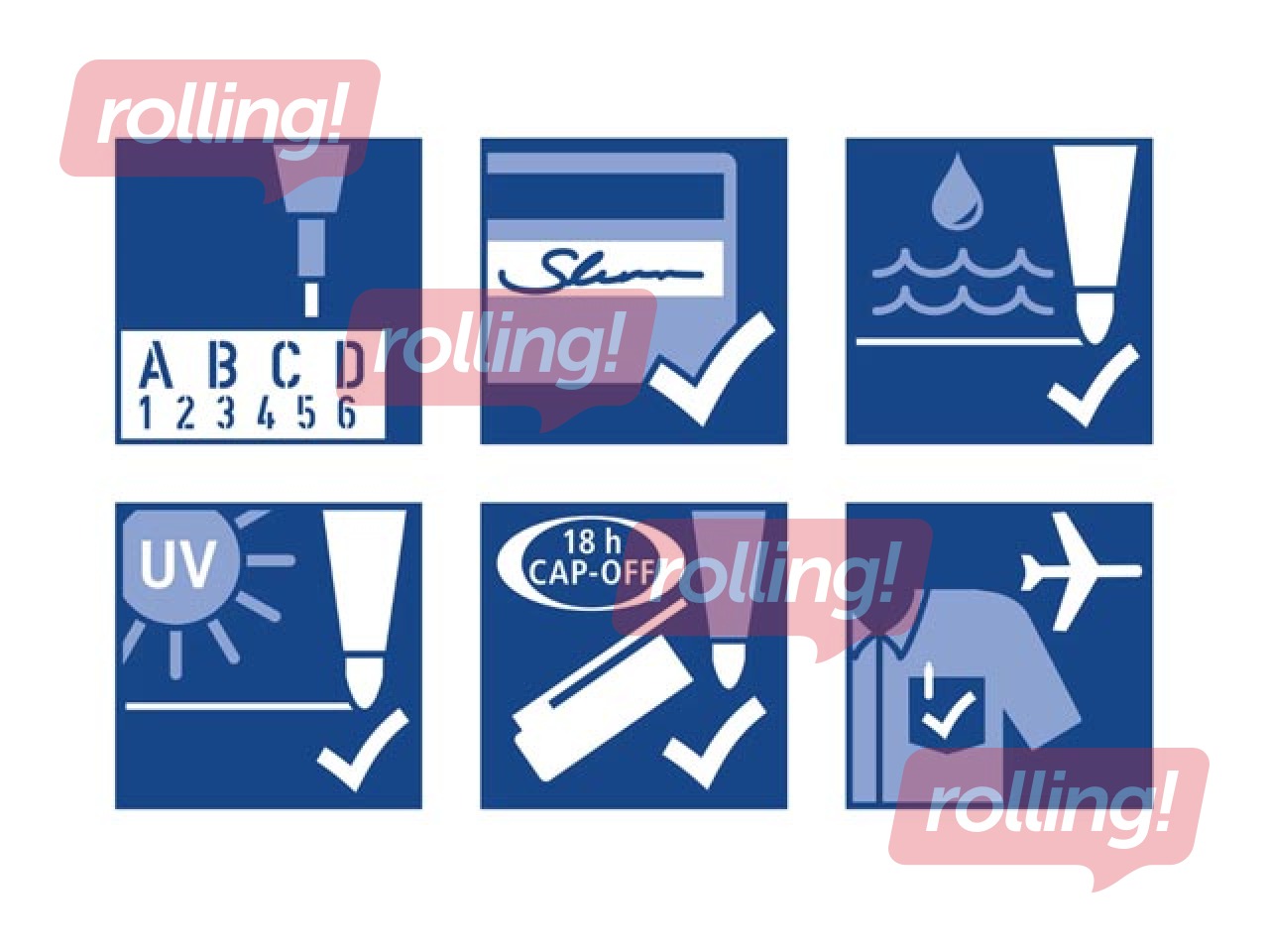 - Pigmenta tinte, neizdzēšama (saskaņā ar ISO 12757-2), gaismas izturīga, ūdensizturīga uz papīra