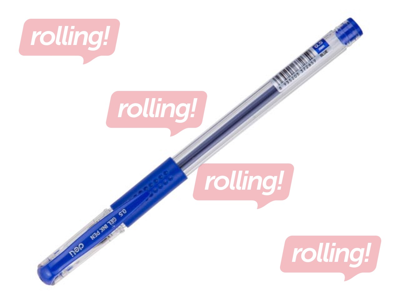Gēla pildspalva ar gumijotu posmu ērtai rakstīšanai un zilu tinti. Korpuss plastmasas caurspīdīgs, pildspalva ar korķīti, līnijas platums 0,5mm.