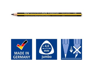 Jumbo grafīta zīmulis ergonomiskā trijstūrveida formā ērtai un vieglai zīmēšanai. Ideāls pirmajiem rakstīšanas un zīmēšanas vingrinājumiem bērniem. Augsta pretestība pret lūšanu, pateicoties īpašajam zīmuļa sastāvam.