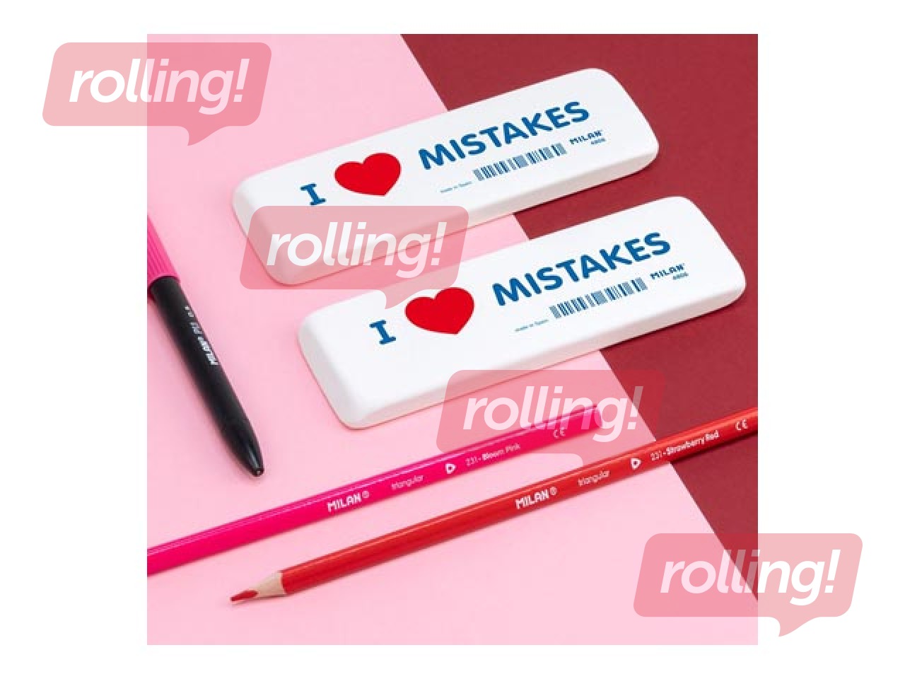 Milan "I Love Mistakes" dzēšgumija ir liela izmēra elastīga sintētiskā gumija ar slīpām malām, kas nodrošina precīzu un efektīvu grafīta zīmējumu dzēšanu no dažādiem papīra veidiem.