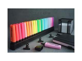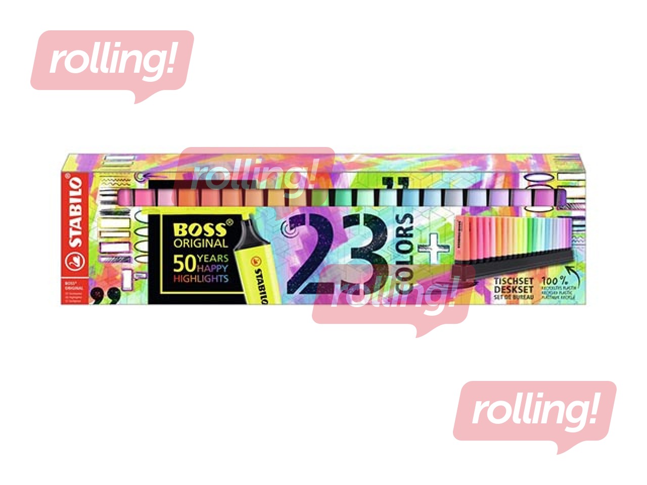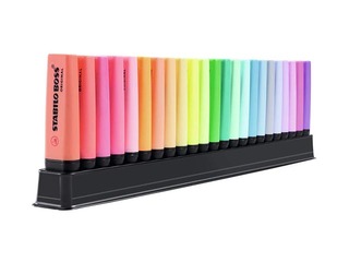 STABILO BOSS marķieru komplekts ar statīvu, kas sastāv no 23 teksta marķieriem dažādās krāsās.