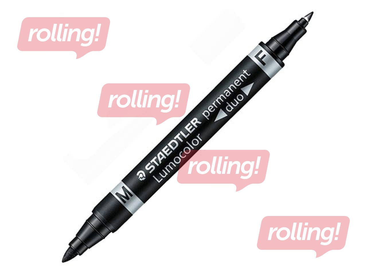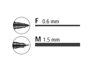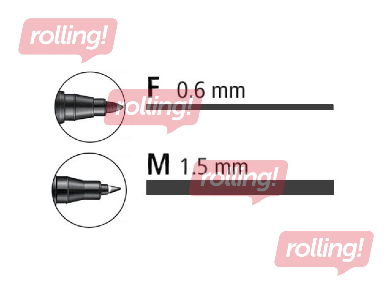 Divi koniski serdeņi, neizžūst, atstājot marķieri bez vāciņa neierobežotu laiku (ISO554), gaismas izturīgs, nožūst 3-6 sekunžu laikā. Līniju platums 0,6 mm un 1,5 mm