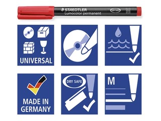 STAEDTLER kaste, kurā ir 8 Lumocolor permanentās krāsas marķieri 8 dažādās krāsās.