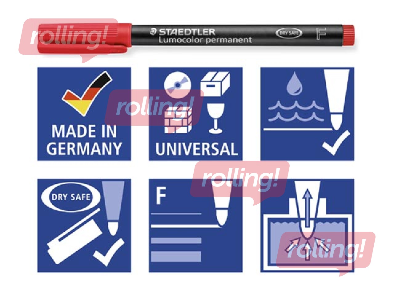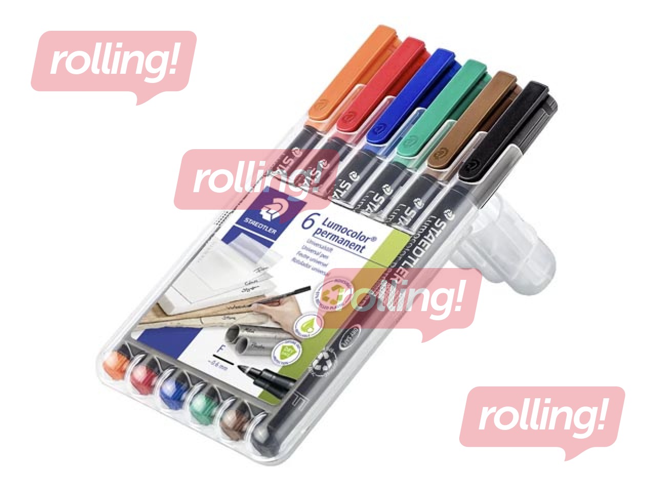 STAEDTLER kaste, kurā ir 8 Lumocolor permanentās krāsas marķieri 6 dažādās krāsās.