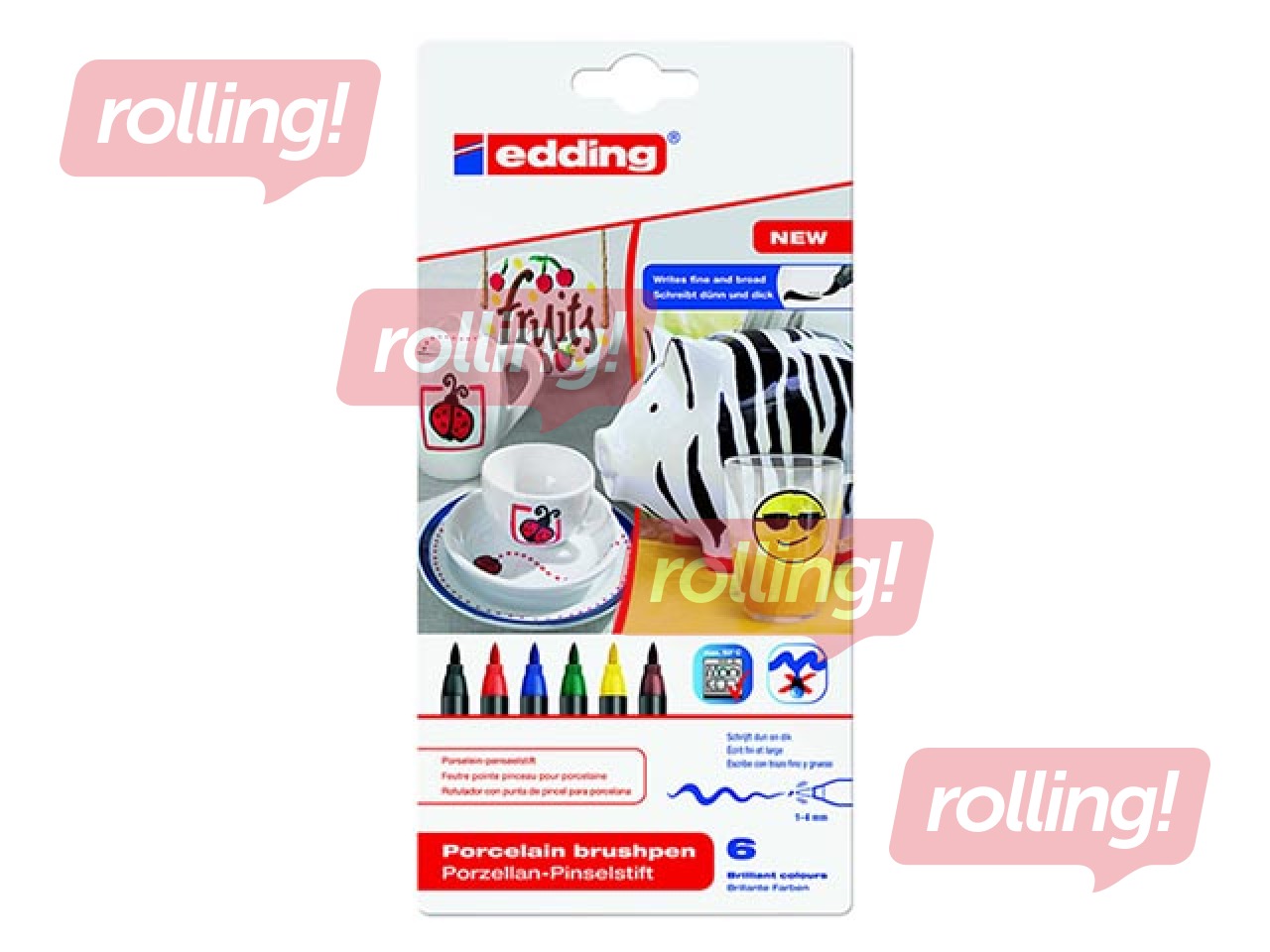 Flomasteris porcelāna izstrādājumiem Edding 4200, asorti krāsas Pielietojams uz keramikas, karstumizturīga stikla virsmām. Elastīgs uzgalis lielāku un mazāku detaļu zīmēšanai (1-4mm). Ātri žūstošs, neitrāla smaka. Lietošanas instrukcija: Pirms lietošanas notīrīt virsmu ar mazgāšanas līdzekli tauku nospiedumu noņemšanai. Ļaut žūt virsmai 15 minūtes pirms ievietošanas krāsnī. Ievietot krāsnī pie 160 ° C, 25 minūtes un pēc tam ļaut atdzist. Pēc lietošanas turēt horizontālā stāvoklī.