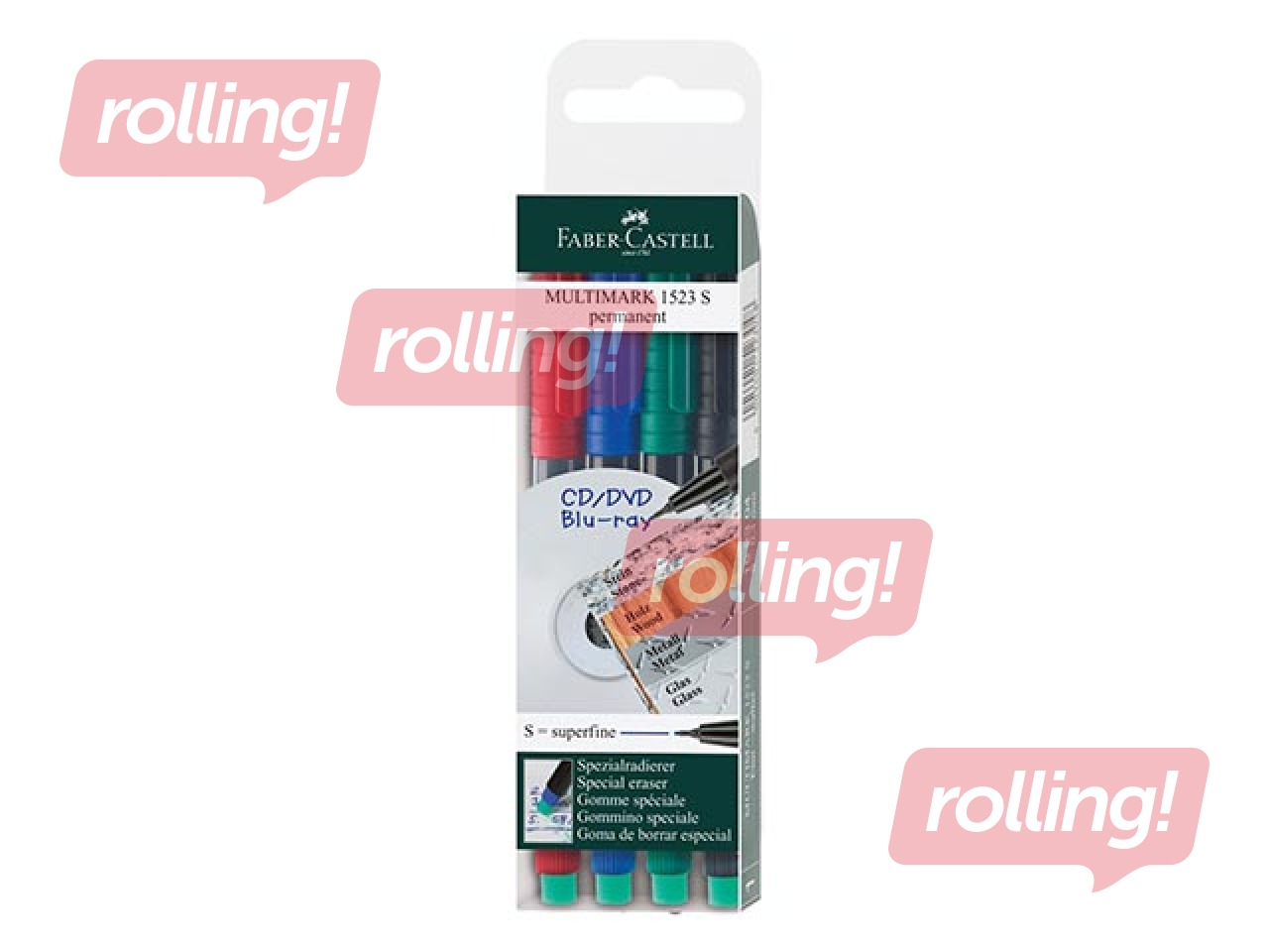 Permanents marķieris dažādām virsmām - OHP, CD, DVD, stiklam, metālam, plastikātam (PP, PET, PVH). Līnijas platums 0.4mm. Ar speciālu dzēšgumiju. Komplektā 4 marķieri: melns, zils, zaļš, sarkans