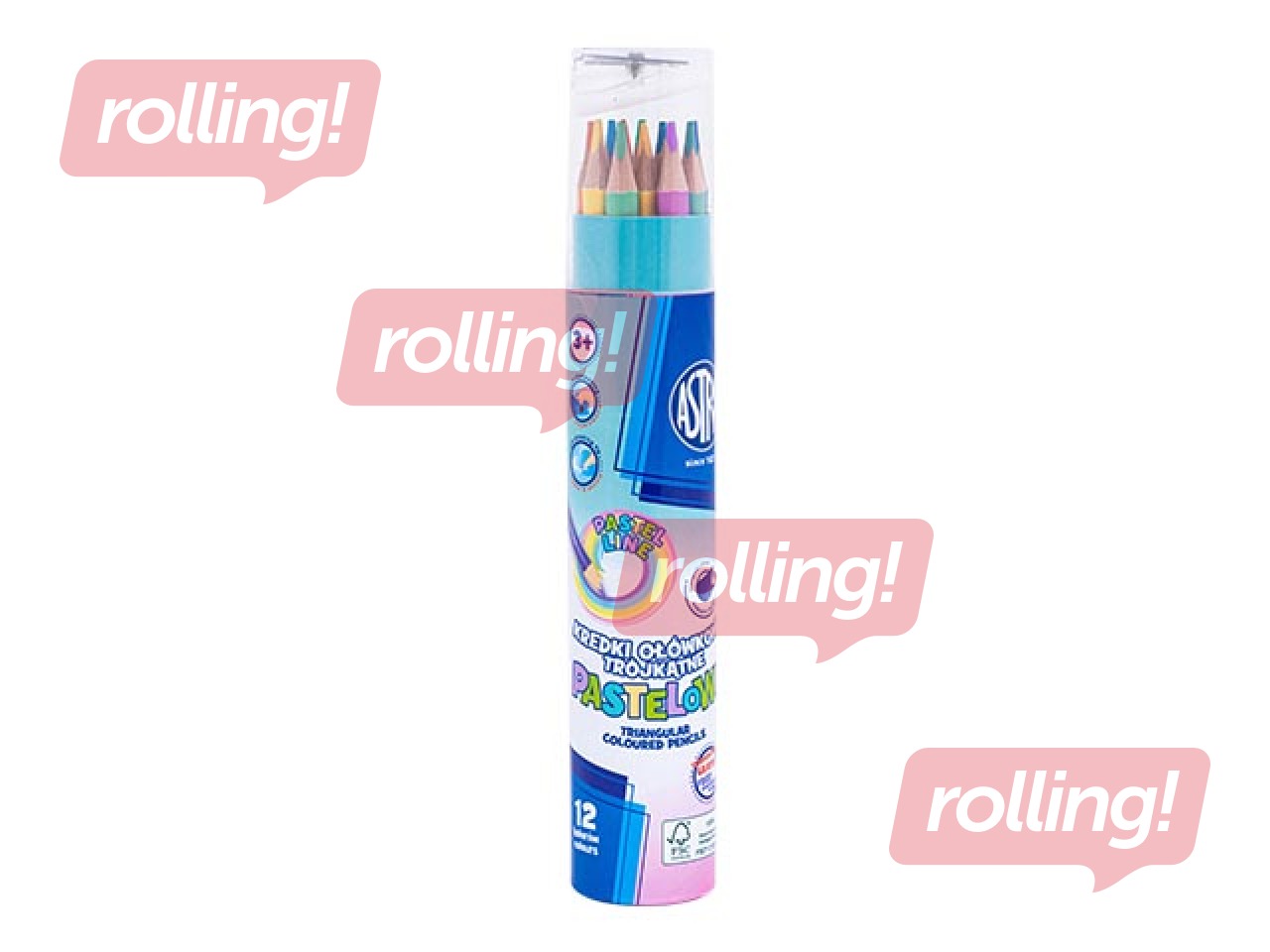 Trīsstūrveida zīmuļi tūbiņā ASTRA - 12 pasteļkrāsas + asināmais