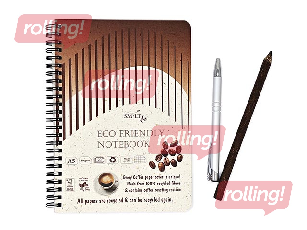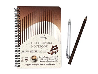 Šī klade ir izgatavota no 100% pārstrādāta papīra, kas ļauj to atkārtoti pārstrādāt. Iekšpusē esošais papīrs satur kafijas grauzdēšanas atlikumus, piešķirot tai unikālu raksturu. Tā ir videi draudzīga izvēle, kas ļauj ietaupīt resursus un samazināt atkritumu apjomu. Ar spirāli pievienotais A5 izmēra rūtiņu formāts un 70 lapas padara to ideāli piemērotu rakstīšanai un piezīmēm.