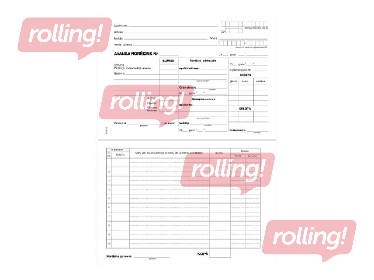 Avansa norēķina dokuments apkopo Avansu personas sākuma atlikumu uz noteikto perioda sākuma datumu, saņemtos maksājumu avansa norēķina periodā, avansa izdevumus avansa norēķina periodā un beigu atlikumu uz noteikto perioda beigu datumu Avansa personas kontā.