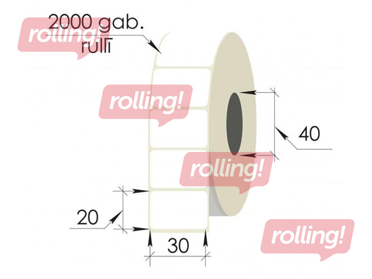 Sintētiska uzlīme no polipropilēna, uz kuras tiek veikta druka ar krāsojošas lentes (ribona) palīdzību. Nav balēšanas, noturīga pret temperatūras maiņu, ārējās vides iedarbību. Izmēri: 30mm platums x 20mm augstums, 1 rinda, iekšējā čaula 40mm, 2000 uzlīmes rullī. Baltas.