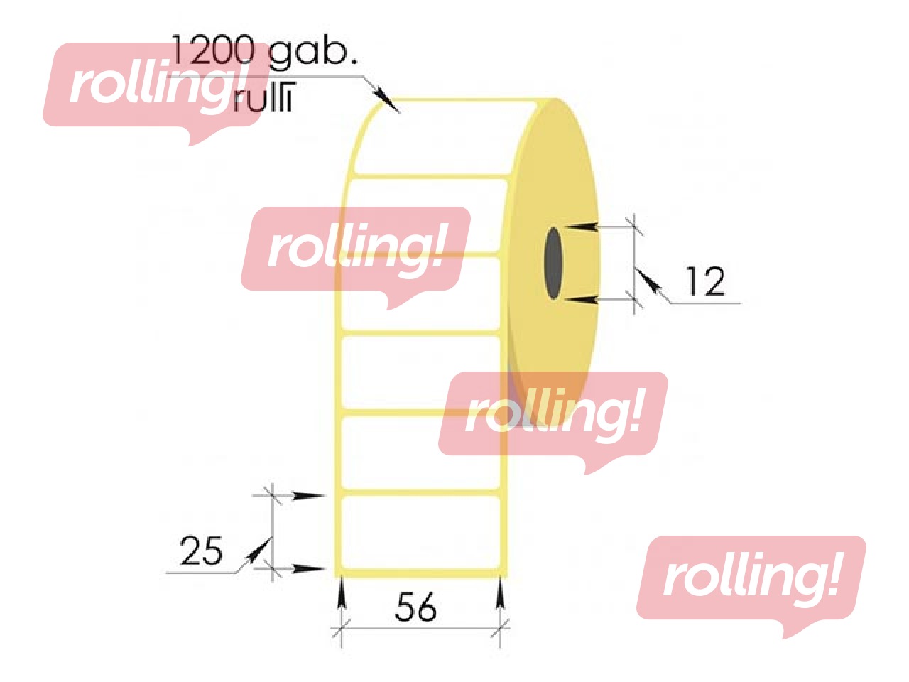 Papīra uzlīme ar termojūtīgu segumu, kurš kļūst tumšs augstas temperatūras ietekmē. Ir jūtīgas pret mitrumu (izpludina attēlu) un augstu temperatūru(dzeltē, balē). Druka bez kārtridža. Izmēri: 56mm platums x 25mm garums, 1 rinda, iekšējā čaula 12mm. 1200 uzlīmes rullī.