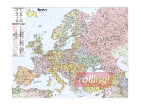 Eiropas politiskajā kartē attēlota visa Eiropas teritorija līdz Urāliem. Tajā dota detalizēta autoceļu un apdzīvoto vietu klasifikācija. Vietvārdi doti oriģinālvalodās, bet skaidrojumi apzīmējumiem 6 valodās. Kartē parādīts Eiropas politiskais iedalījums atbilstoši mūsdienu situācijai, izceļot teritorijas ar nenoregulētu politisko statusu (Ziemeļkipra, Piedņestra, Abhāzija, Dienvidosetija, Karabaha).