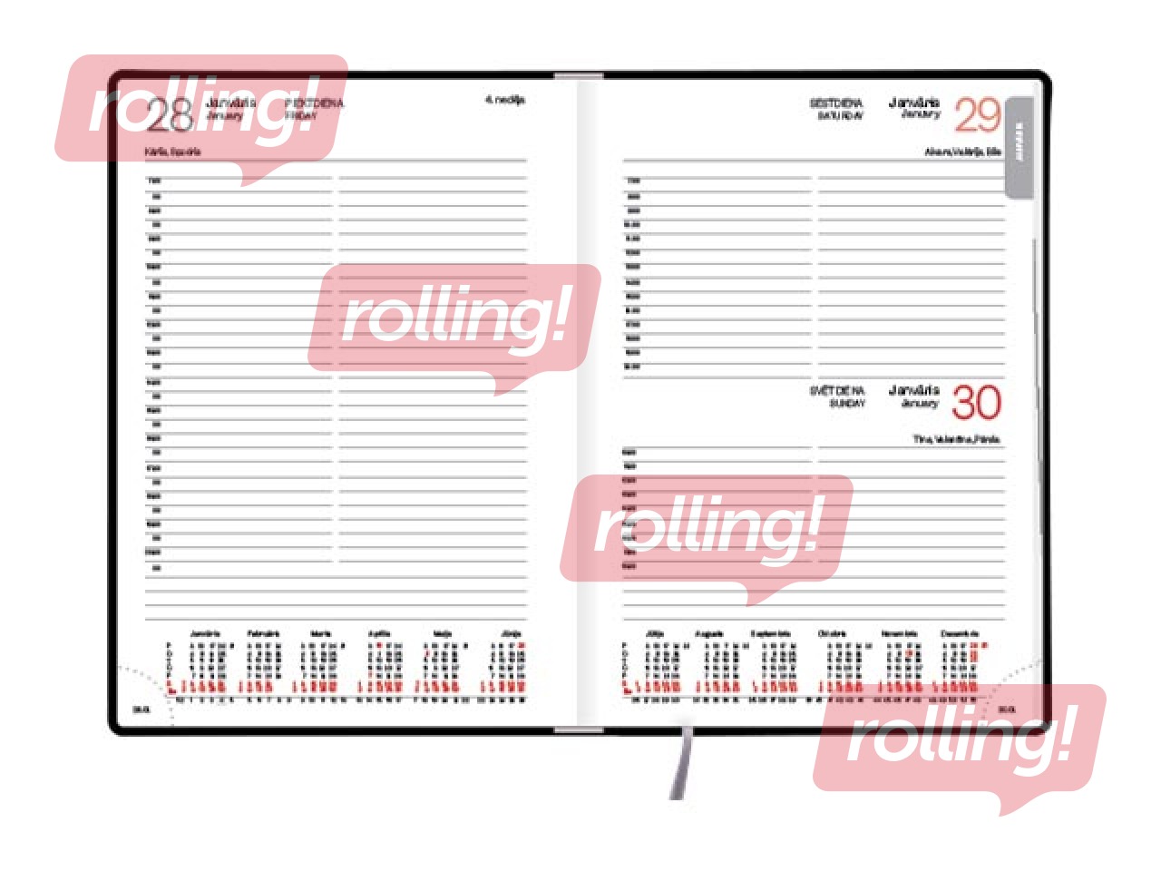 Kalendārs: viena diena lappusē, trīs valodās (latviešu, angļu, krievu).