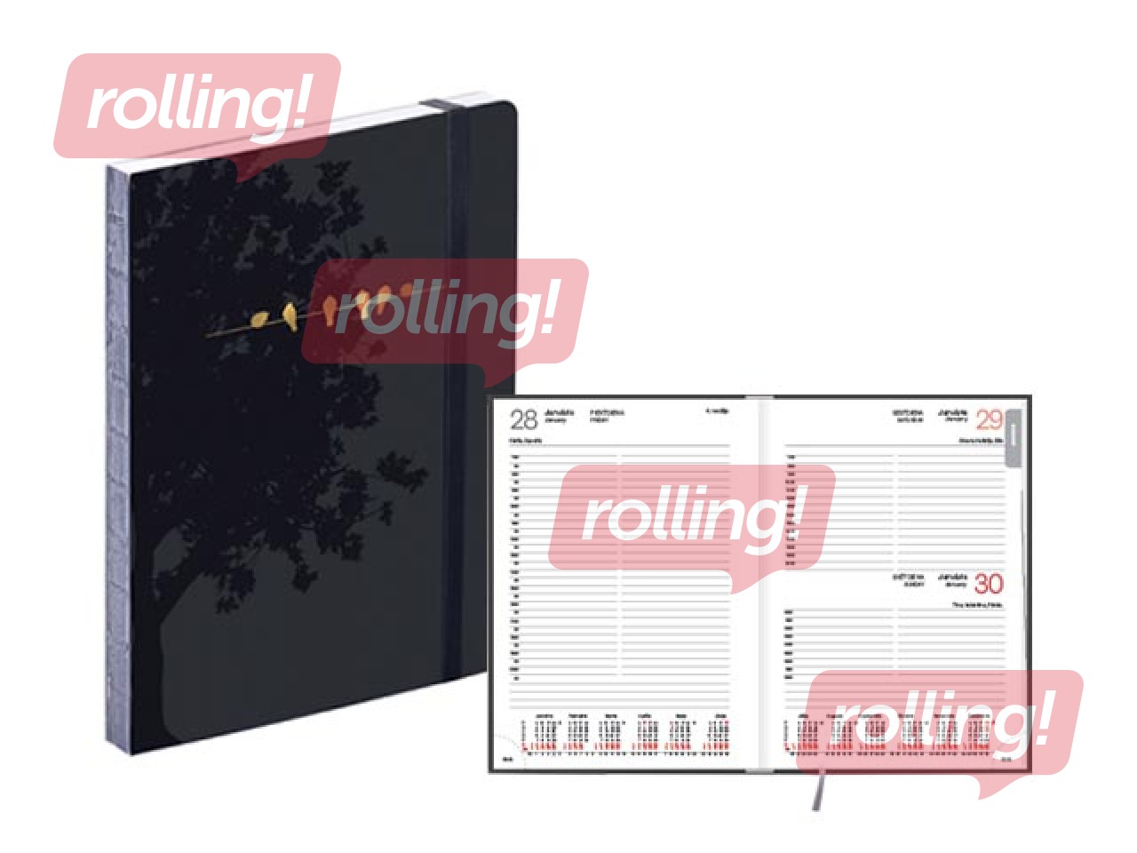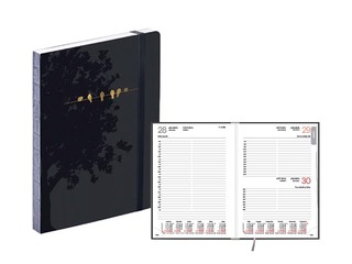 Plānotājs ar atvērtā sējuma veidu, redzamas sašuvuma vietas (krāsota melna muguriņa), 180 grādu pilnīgs atvērums.