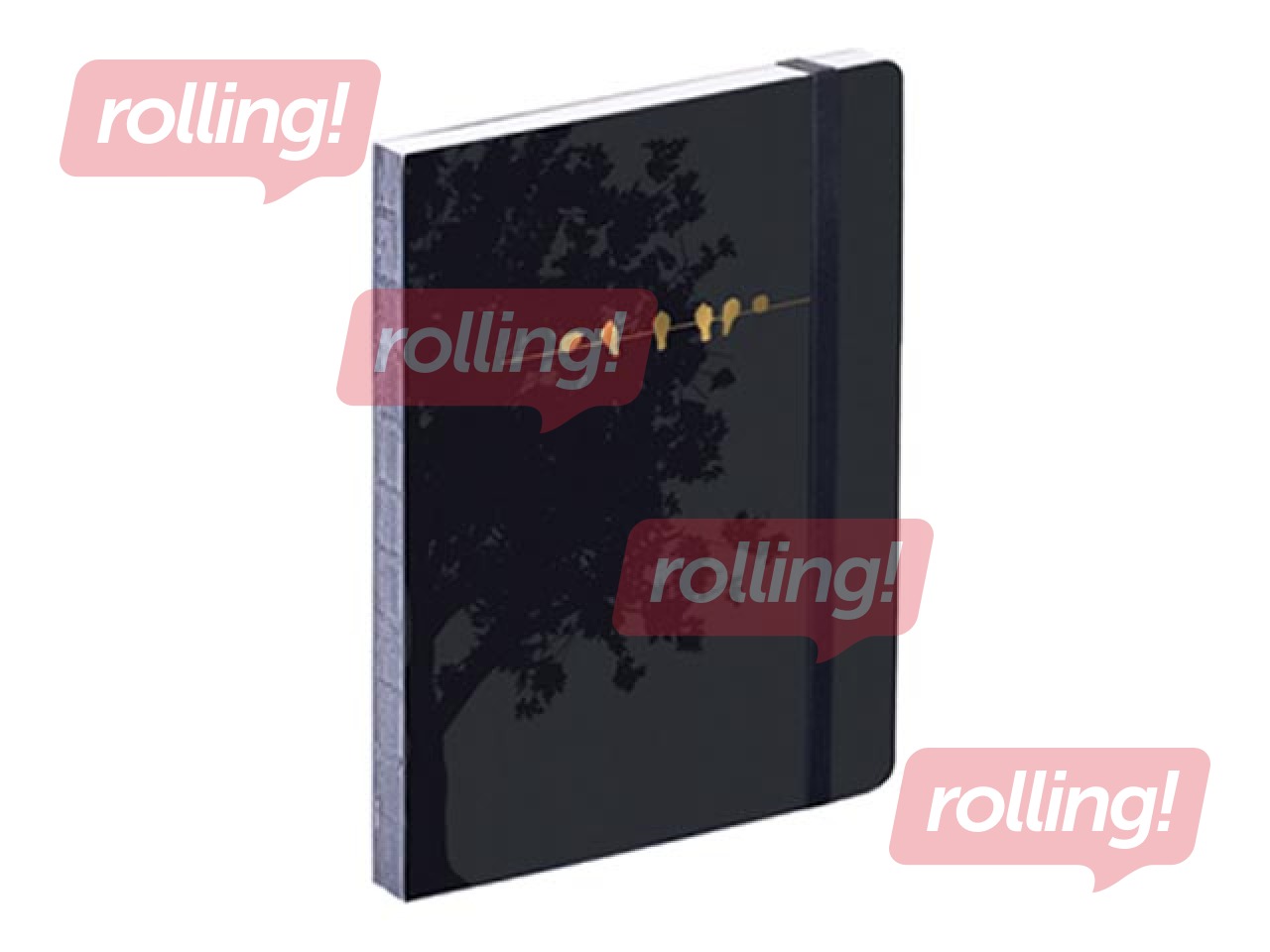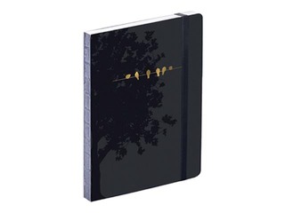 Melns kartona vāks ar melnu laku un zelta follijas uzspiedumu,noapaļotiem stūriem, gumijas aizdare.