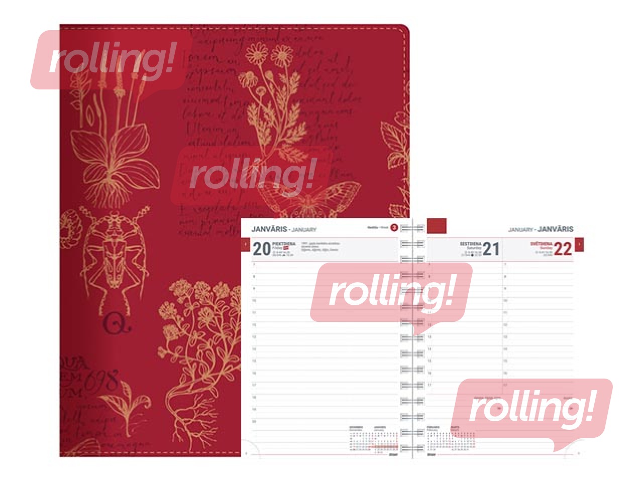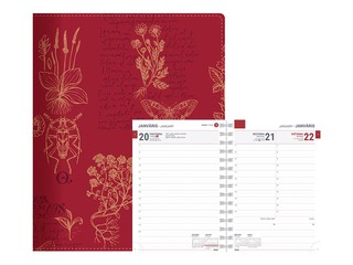Papildus informācija: Polsterēti mākslīgās ādas vāki ar nošūtu malu, moderni krāsu un materiālu salikumi, reljefa iespiedums uz vāka, ar spirāli, perforēti noplēšami lapu stūrīši