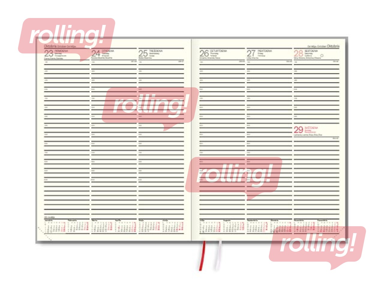 Kalendārs: viena nedēļa atvērumā, 2 valodās (latviešu, angļu). Izmērs: 205 mm x 260 mm.