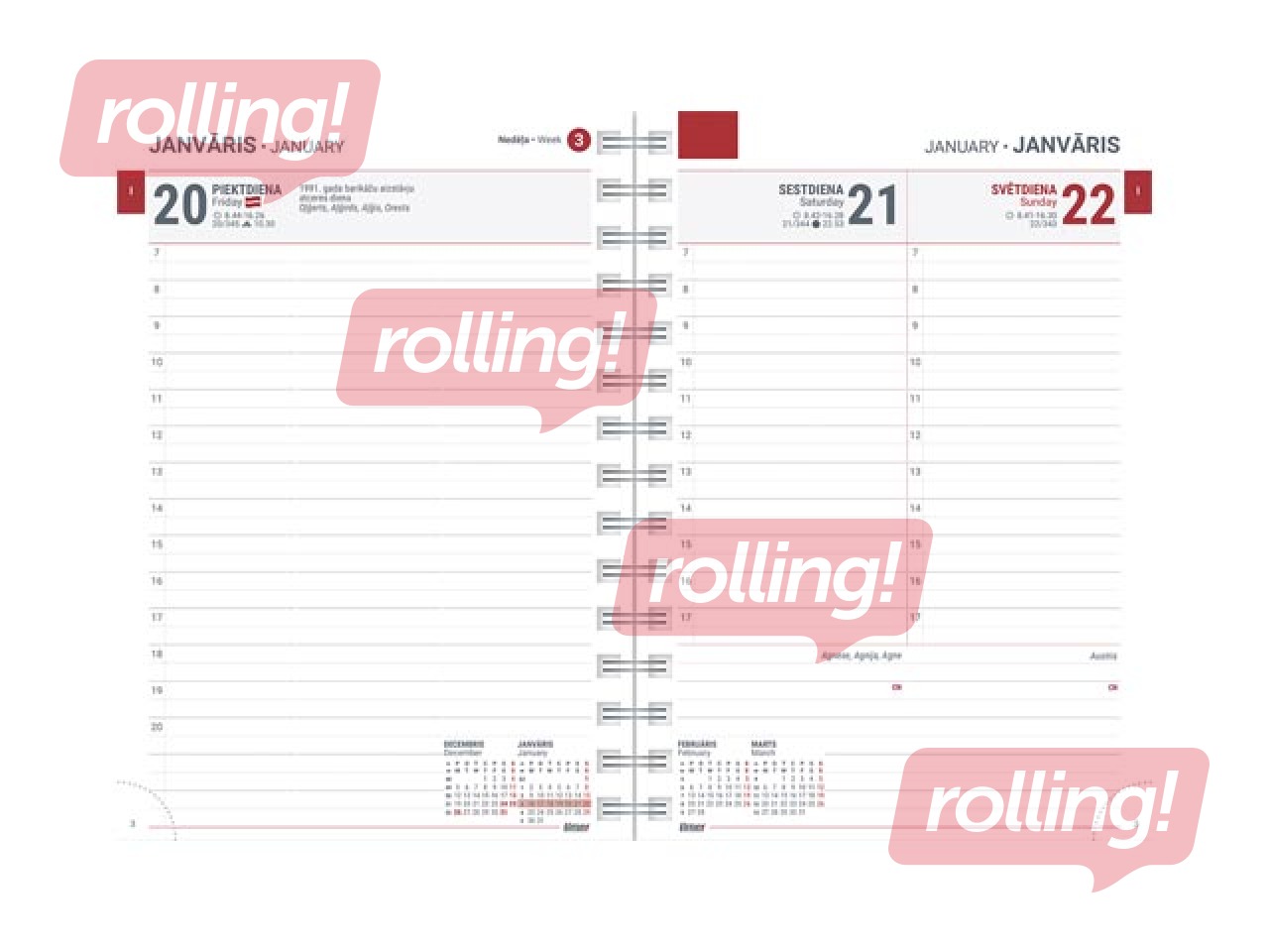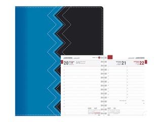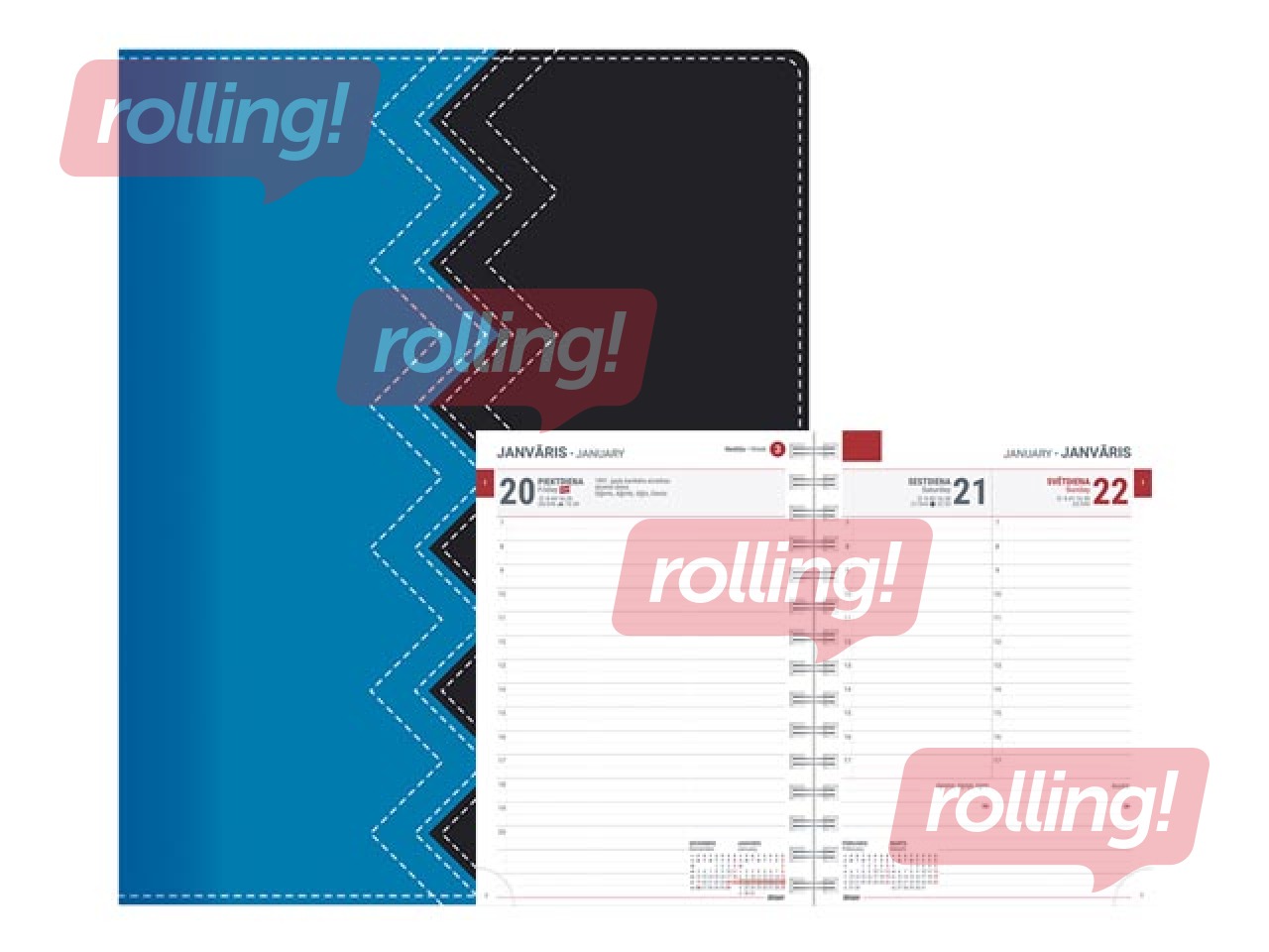 Papildus informācija: Polsterēti mākslīgās ādas vāki ar nošūtu malu, moderni krāsu un materiālu salikumi, reljefa iespiedums uz vāka, ar spirāli, perforēti noplēšami lapu stūrīši.