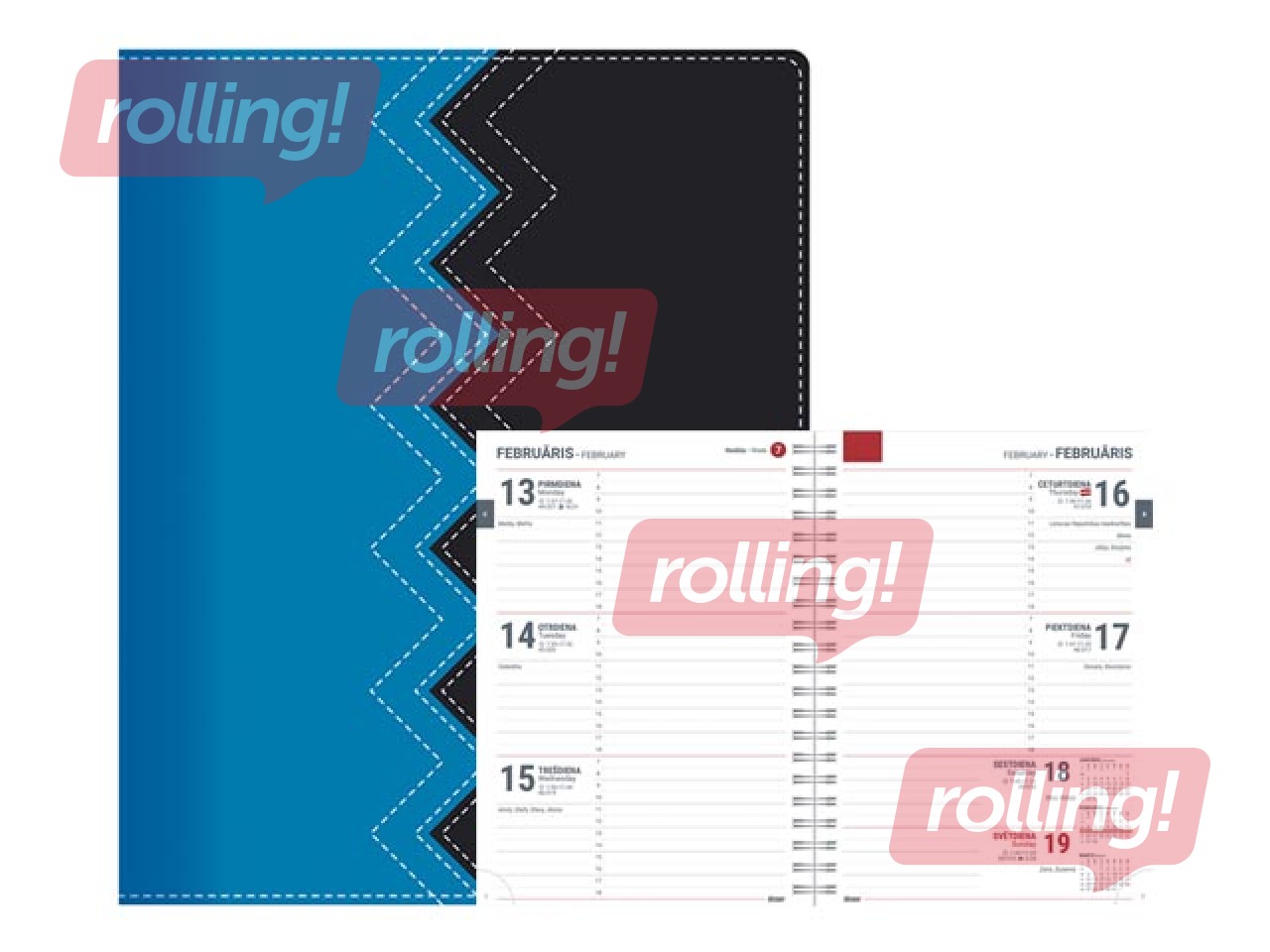 Papildus informācija: Polsterēti mākslīgās ādas vāki ar nošūtu malu, moderni krāsu un materiālu salikumi, reljefa iespiedums uz vāka, ar spirāli, perforēti noplēšami lapu stūrīši