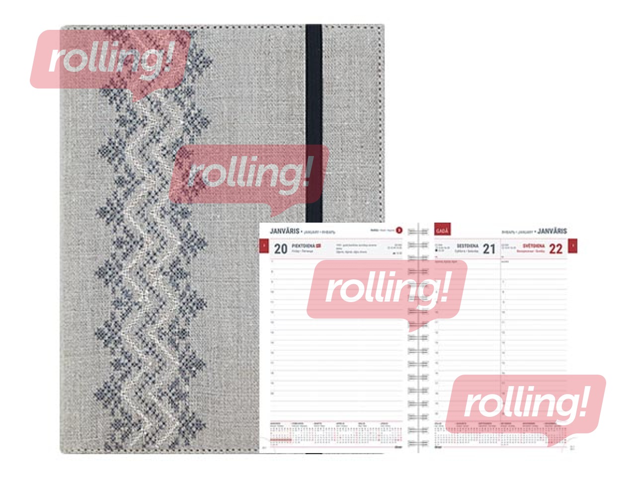 Papildinformācija: Vienas dienas atvērums. Vāki no 100% lina ar etnogrāfisku rakstu, ar spirāli, perforēti noplēšami lapu stūrīši.