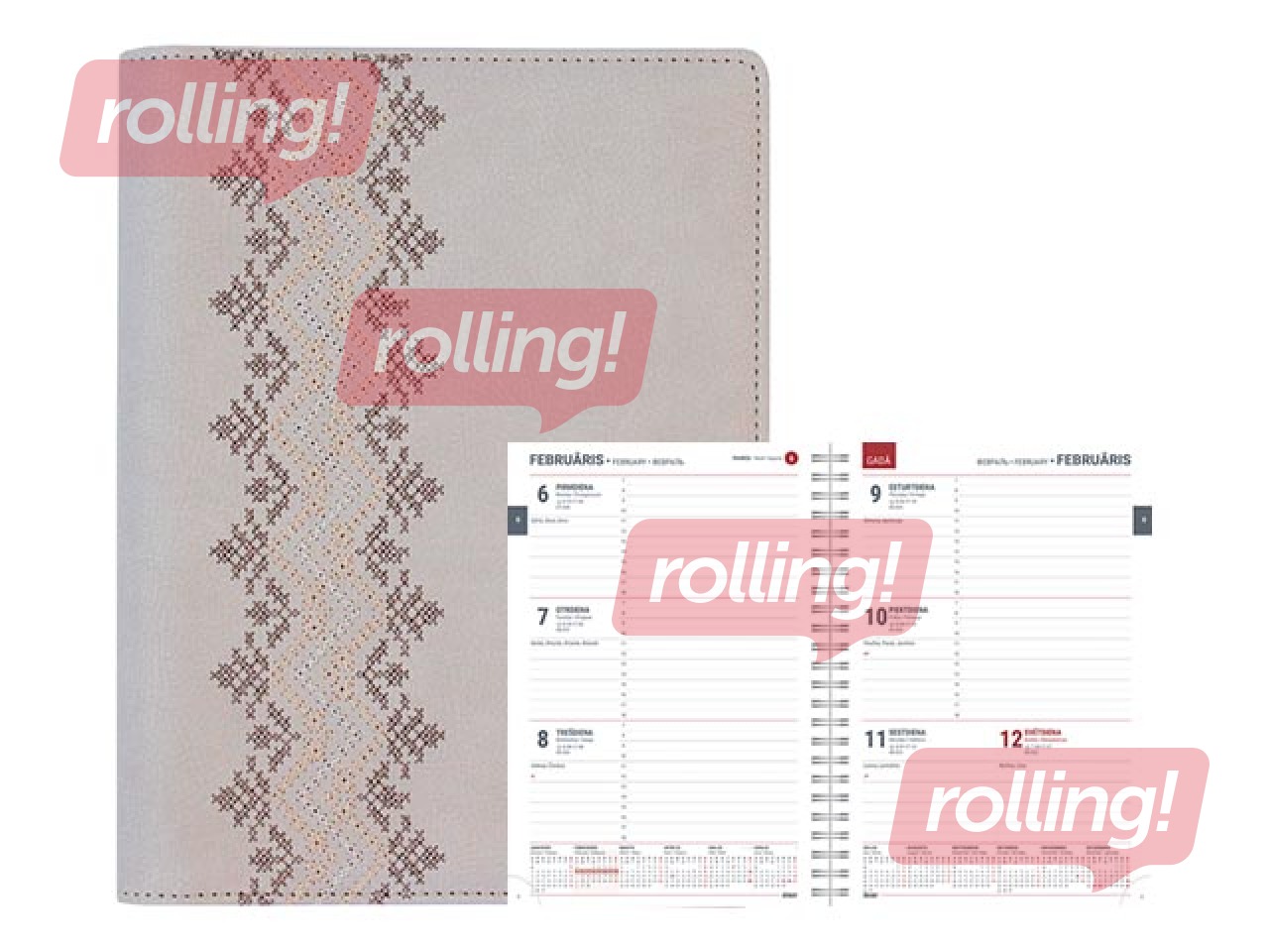 Kalendārs: viena nedēļa atvērumā, 2 valodas (latviešu, angļu).