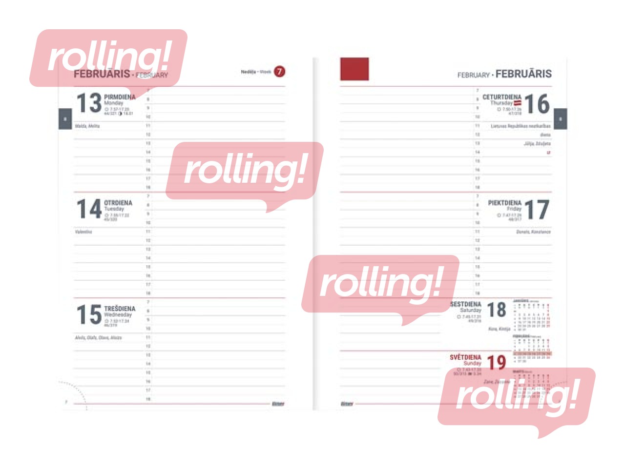 Apraksts: Visos plānotājos TEMPO NEDĒĻA ir tabulas kalendārs, gada plāns, viena nedēļa atvērumā, nedēļu numerācija, valsts svētku un atzīmējamās dienas, karogu dienas, vārda dienas, 38 citu valstu svētku dienas, norādīta pāreja uz vasaras un ziemas laiku, gadalaiku sākums, saullēkta un saulrieta laiki, mēness fāzes, zodiaka zīmju maiņas dienas, svarīgi telefona numuri, attālumu tabula, tālsarunu kodi, pasaules laiki, izmēru un mērvienību tabulas, kontaktu un piezīmju lapas.