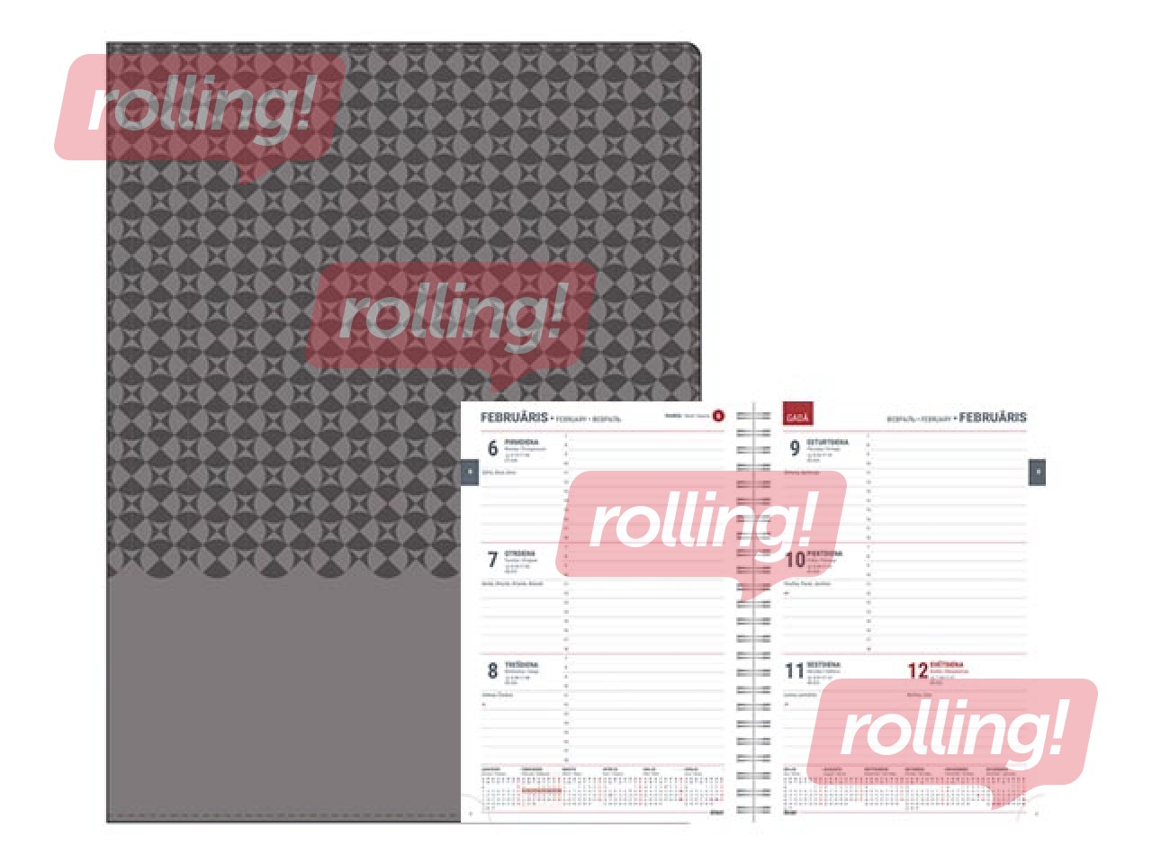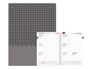 Papildinformācija: Polsterēti mākslīgās ādas vāki ar nošūtu malu, moderni krāsu un materiālu salikumi, reljefa iespiedums uz vāka, telefongrāmatiņa, karte, ar spirāli, perforēti noplēšami lapu stūrīši