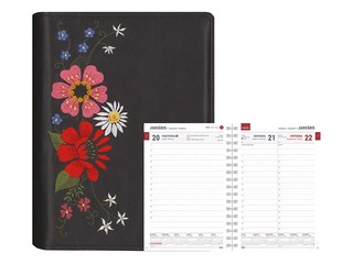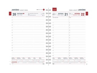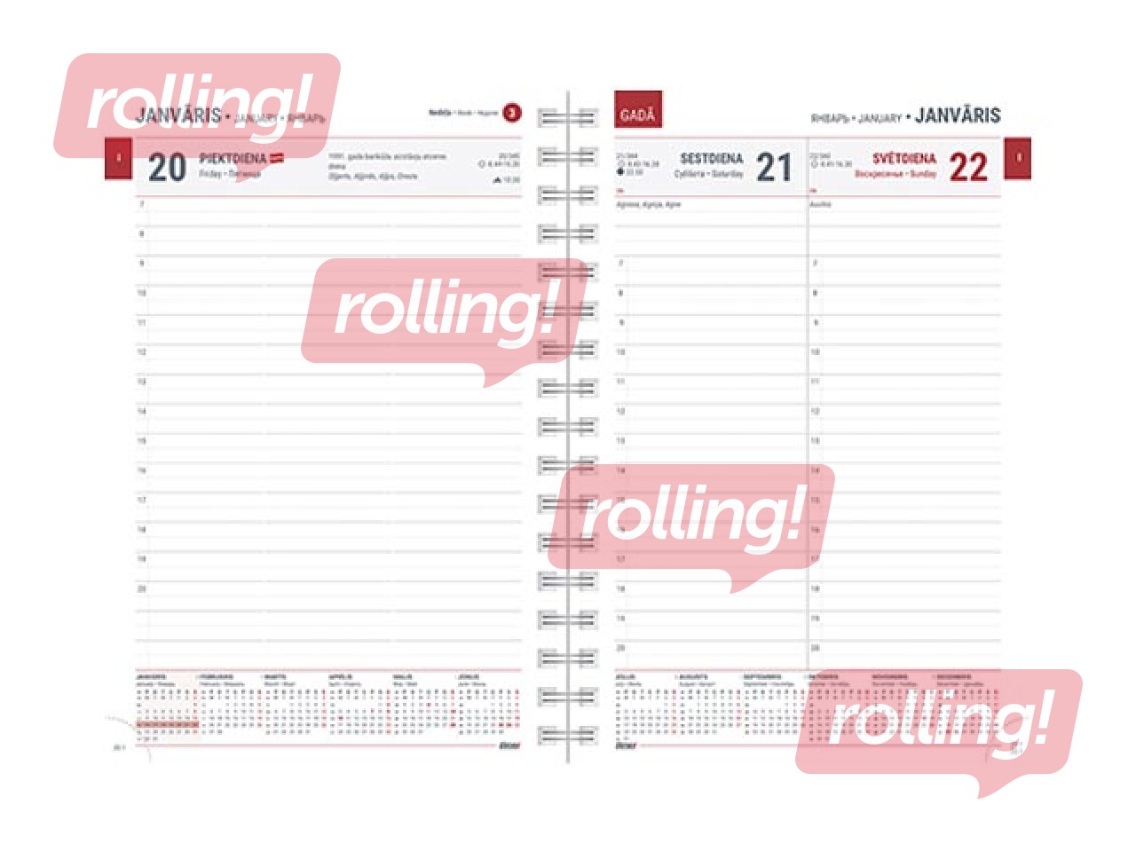 Apraksts: Visās A5 formāta dienasgrāmatās ir tabulas kalendārs, gada plāns, nedēļu numerācija, valsts svētku un atzīmējamās dienas, karogu dienas, vārda dienas, 38 citu valstu svētku dienas, norādīta pāreja uz vasaras un ziemas laiku, gadalaiku sākums, saullēkta un saulrieta laiki, mēness fāzes, zodiaka zīmju maiņas dienas, kontaktu un piezīmju lapas.