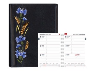 Papildinformācija: Polsterēti mākslīgās ādas vāki ar izšūtu etnogrāfisku rakstu un nošūtu malu, ar spirāli, perforēti noplēšami lapu stūrīši.
