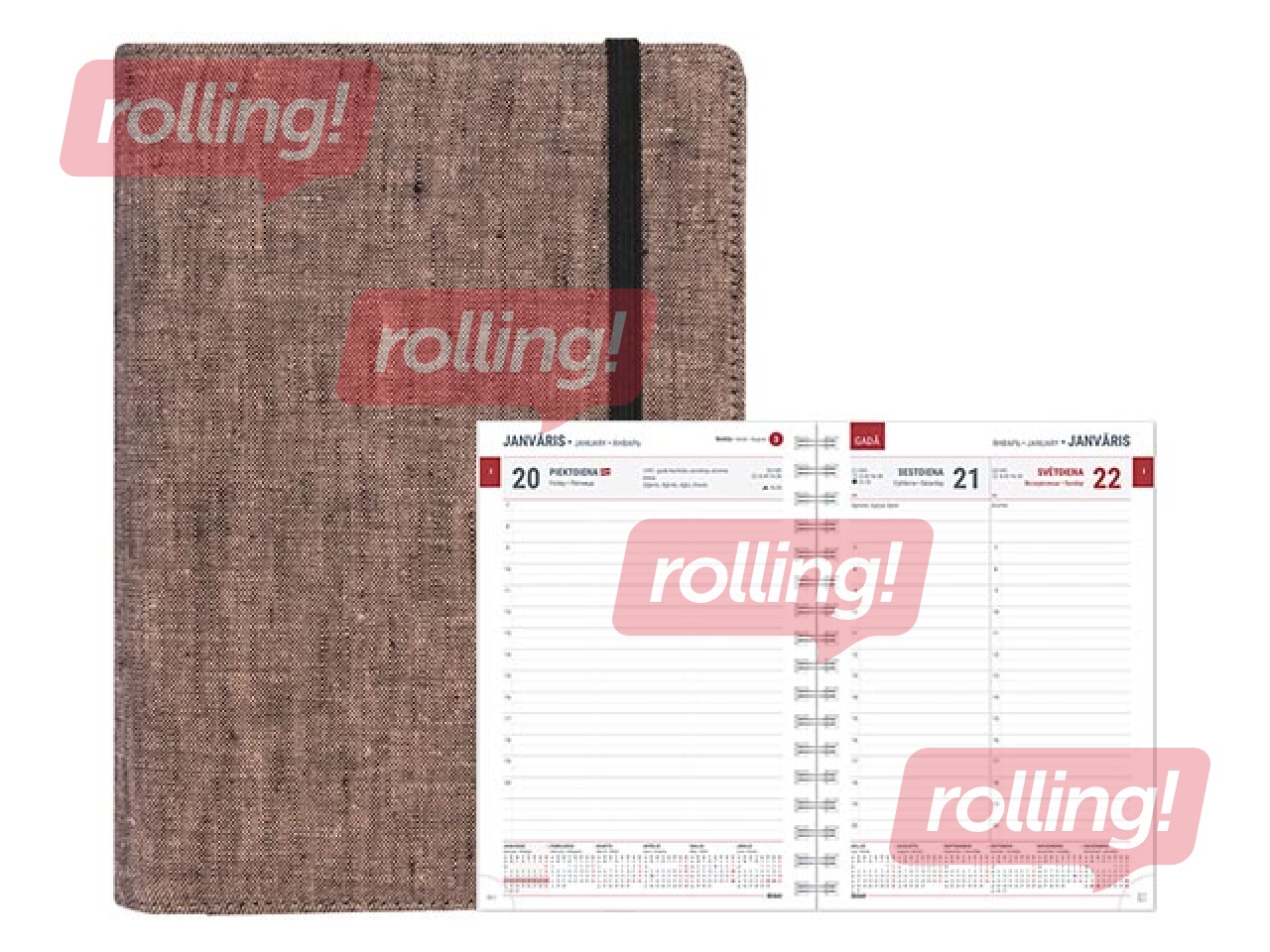 Apraksts: Visās A5 formāta dienasgrāmatās ir tabulas kalendārs, gada plāns, nedēļu numerācija, valsts svētku un atzīmējamās dienas, karogu dienas, vārda dienas, 38 citu valstu svētku dienas, norādīta pāreja uz vasaras un ziemas laiku, gadalaiku sākums, saullēkta un saulrieta laiki, mēness fāzes, zodiaka zīmju maiņas dienas, kontaktu un piezīmju lapas.