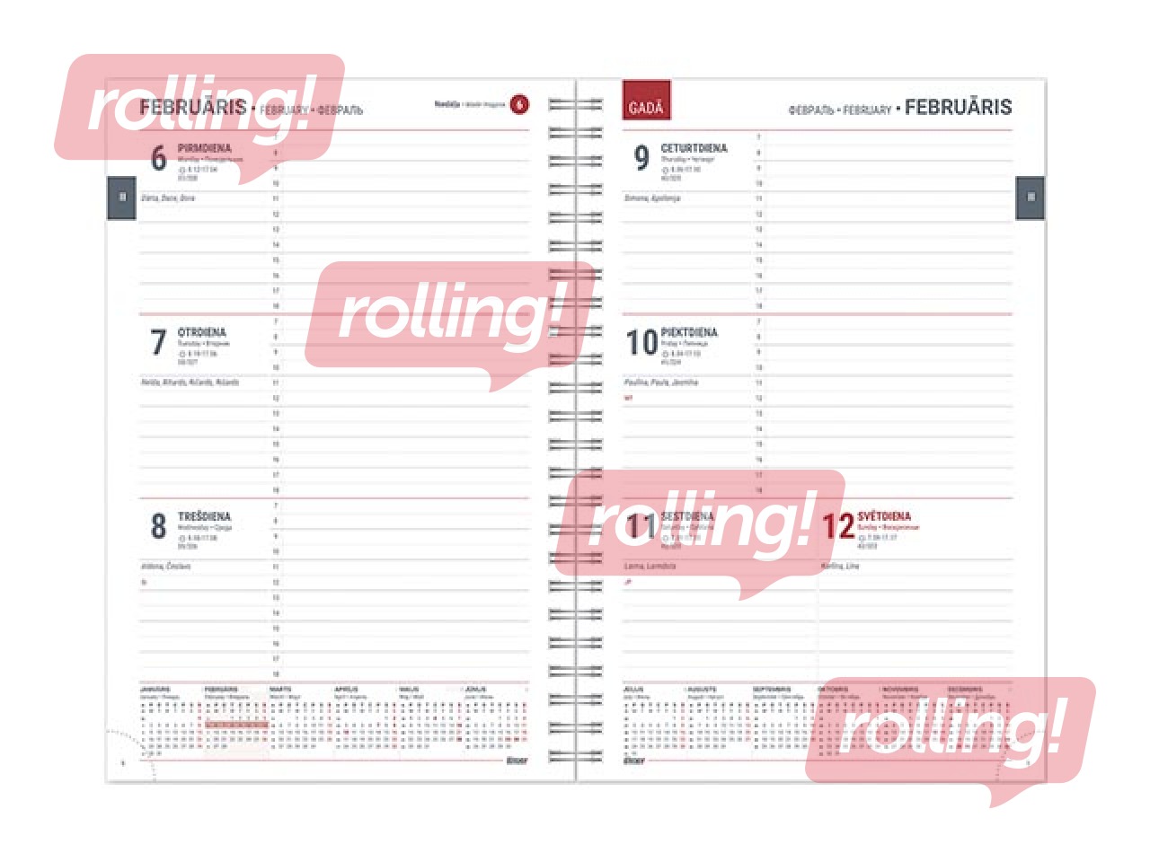 Apraksts: Visās A5 formāta dienasgrāmatās ir tabulas kalendārs, gada plāns, nedēļu numerācija, valsts svētku un atzīmējamās dienas, karogu dienas, vārda dienas, 38 citu valstu svētku dienas, norādīta pāreja uz vasaras un ziemas laiku, gadalaiku sākums, saullēkta un saulrieta laiki, mēness fāzes, zodiaka zīmju maiņas dienas, kontaktu un piezīmju lapas.