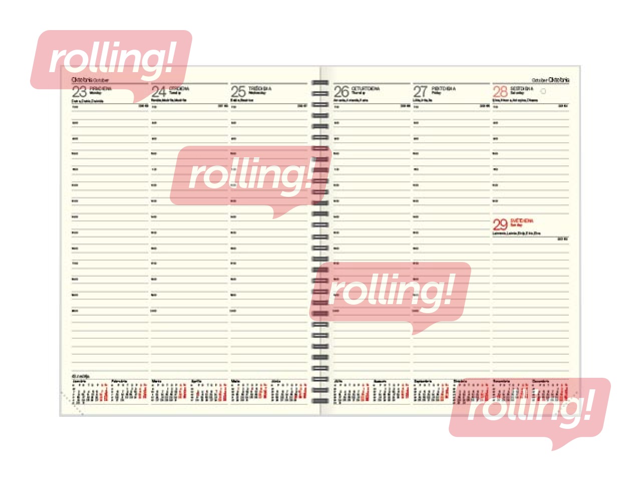 Kalendārs: viena nedēļa atvērumā, 2 valodās (latviešu, angļu).