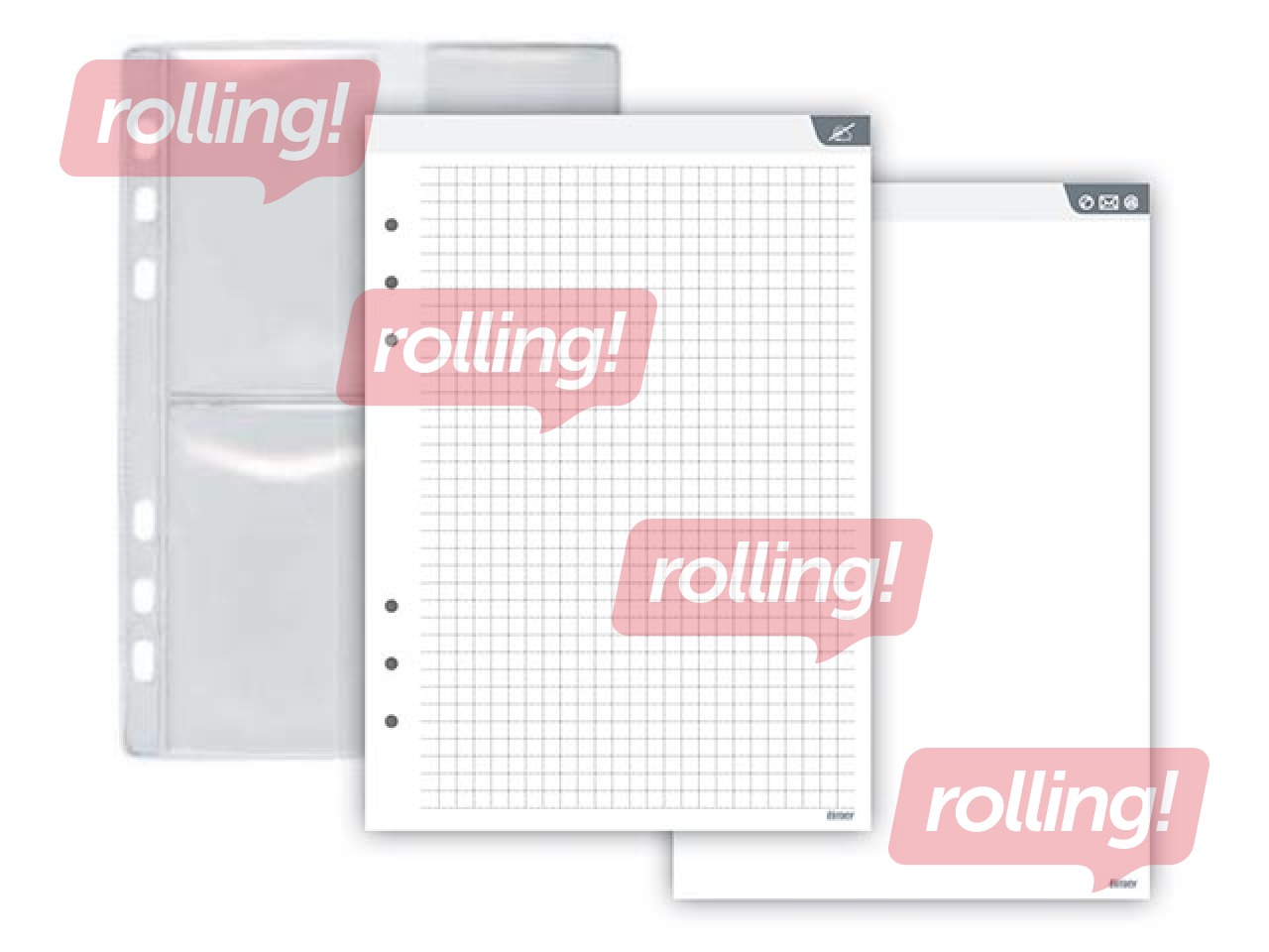 Kontaktu lapas (30), vizītkaršu kabatas (5 lapas), piezīmju lapas (30 lapas), 6 caurumi gredzenu stiprinājumiem.