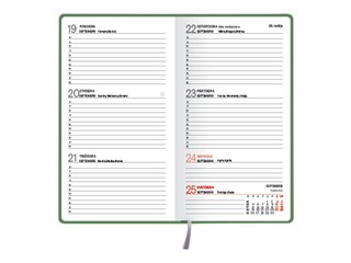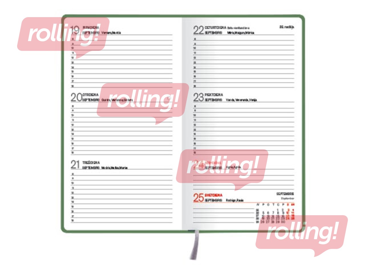 Kalendārs: viena nedēļa atvērumā. Izmērs: 92 mm x 160 mm.