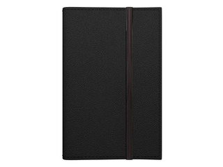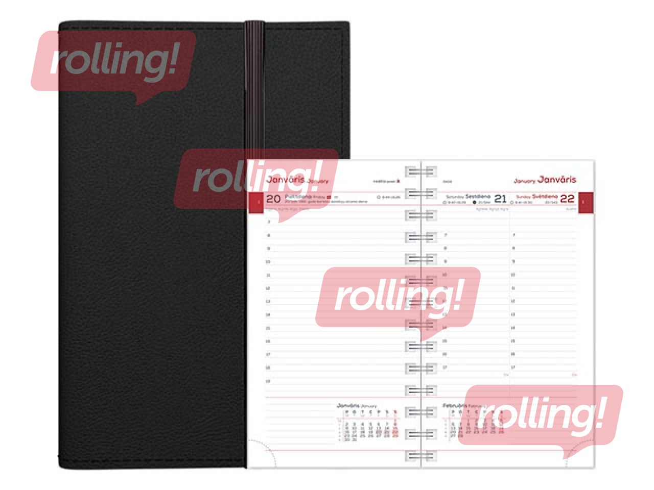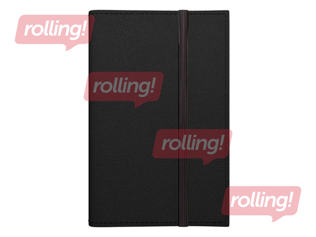 Elastīgi mākslīgās ādas vāki, gumijas aizdare, vāku iekšpusē kabatas un blociņš pierakstiem, ar spirāli, perforēti noplēšami lapu stūrīši.