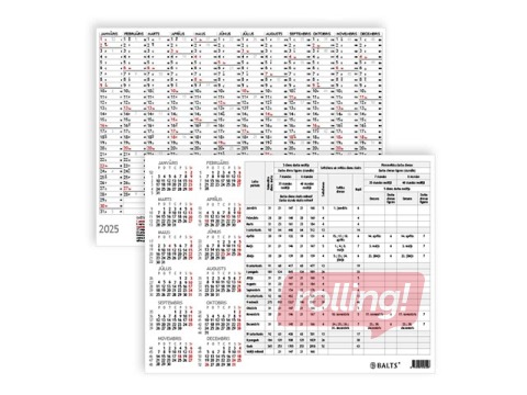 Kalendārs: 12 mēneši katrā pusē 1. pusē gada pārskats, 2. pusē noderīga informācija grāmatvedim.