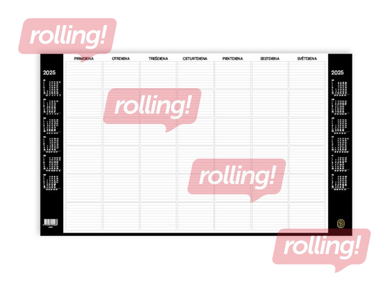 Kalendārs: 12 lapas, viens mēnesis lapā. Izmērs: A2 – 420 mm x 594 mm. Apdare: bloka stiprinājums ar līmi.