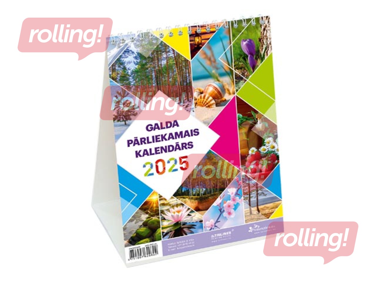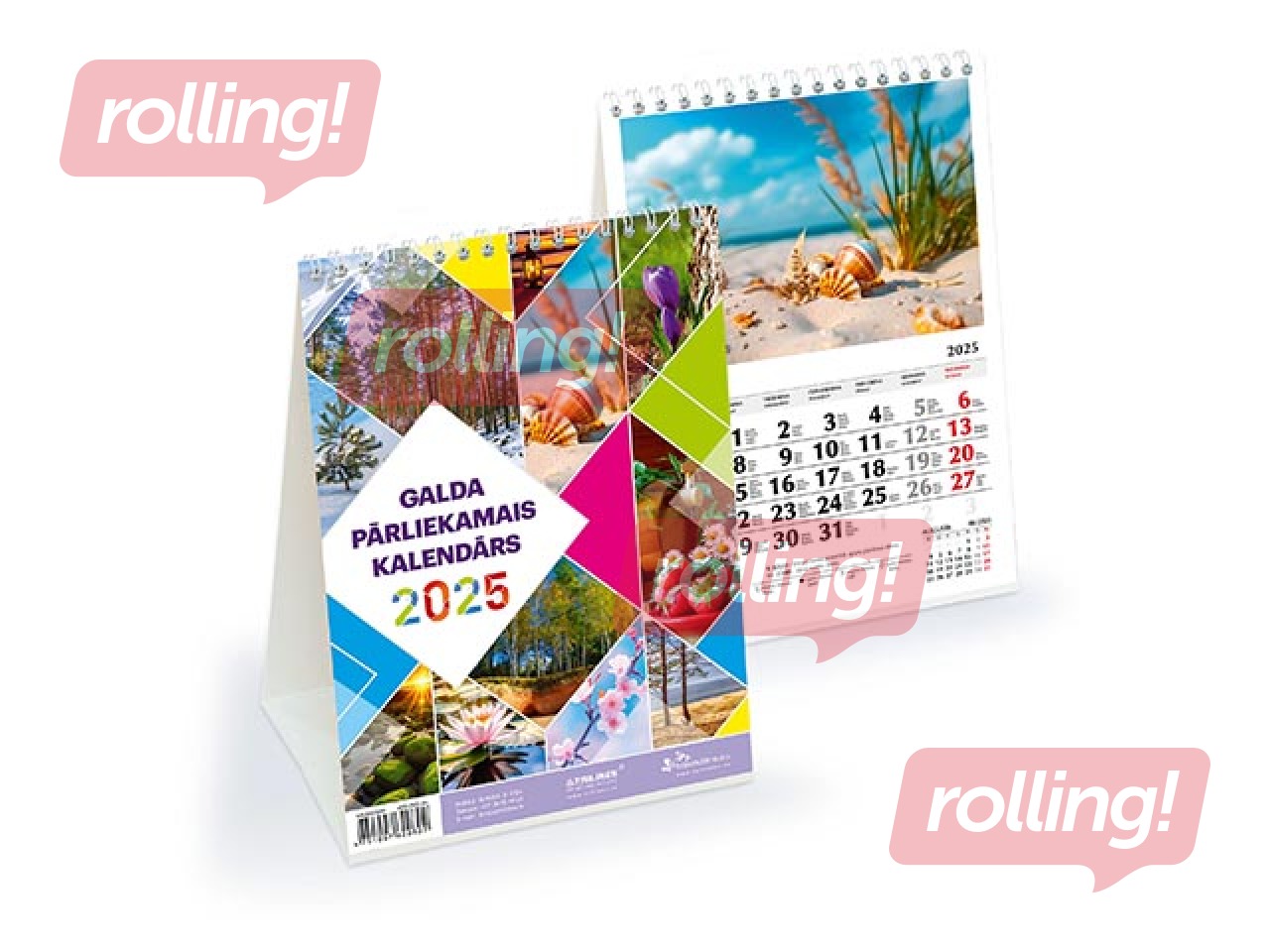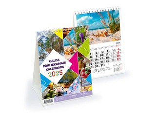 Piramīdveida vertikālais galda kalendārs ar kartona pamatni, krāsainām mēnešu lapām, sastiprināts ar metāla spirāli. Satur vārda dienas, mēness fāzes, Latvijas svētku, atceres un atzīmējamās dienas. PP iepakojumā.