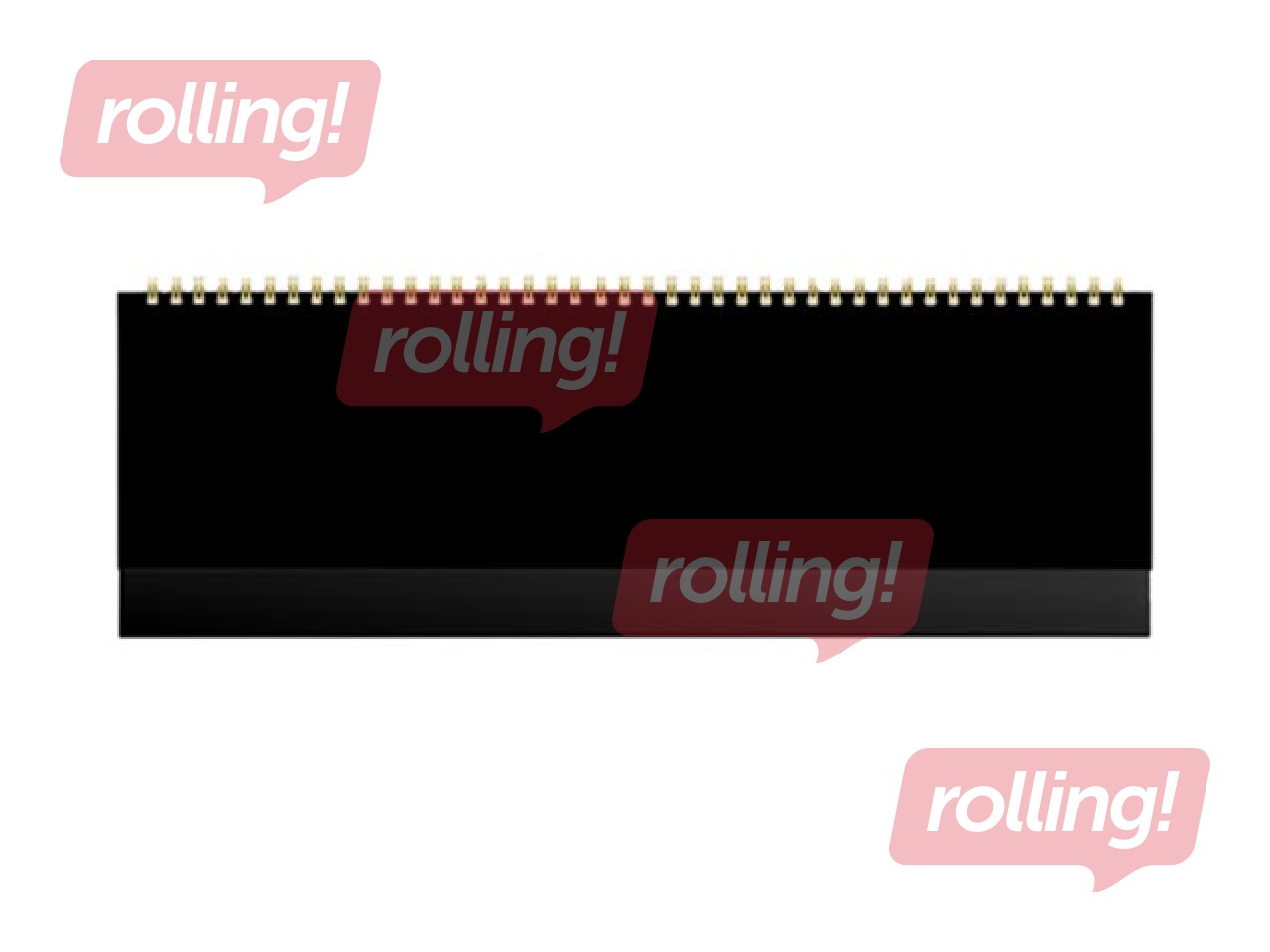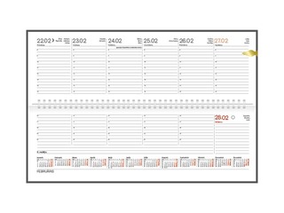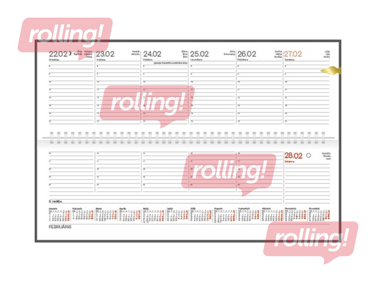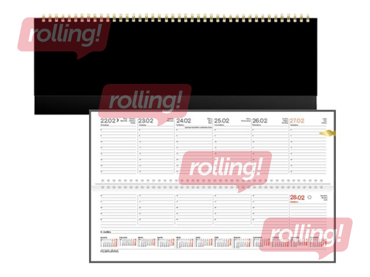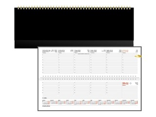 Kalendārs: viena nedēļa atvērumā. Izmērs: 300 mm x 100 mm. Apdare: FSC sertificēts papīrs, apdrukāts kartona vāks,