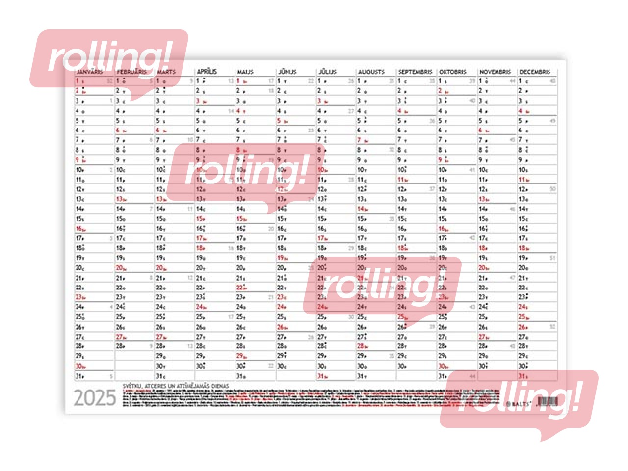 Kalendārs: 12 mēneši vienā pusē. Izmērs: 622 mm x 432 mm
