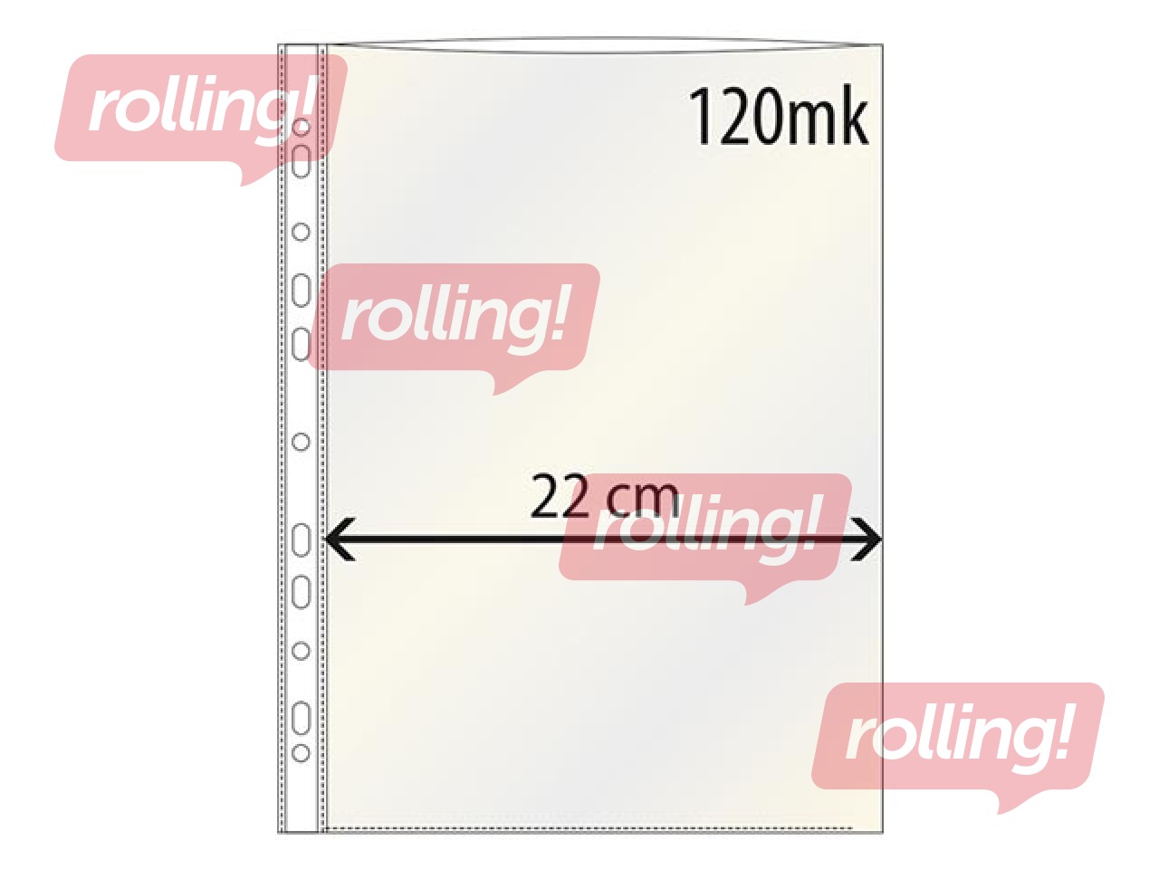 Dokumentu kabatiņas izgatavotas no polipropilēna plēves (PP), biezums 120 mk. Kristāldzidra virsma. Īpaši platas- formāts A4+. Universāla sānu mala ar 11 caurumiem. Iepakojumā 25 kabatas. Cena norādīta par iepakojumu.