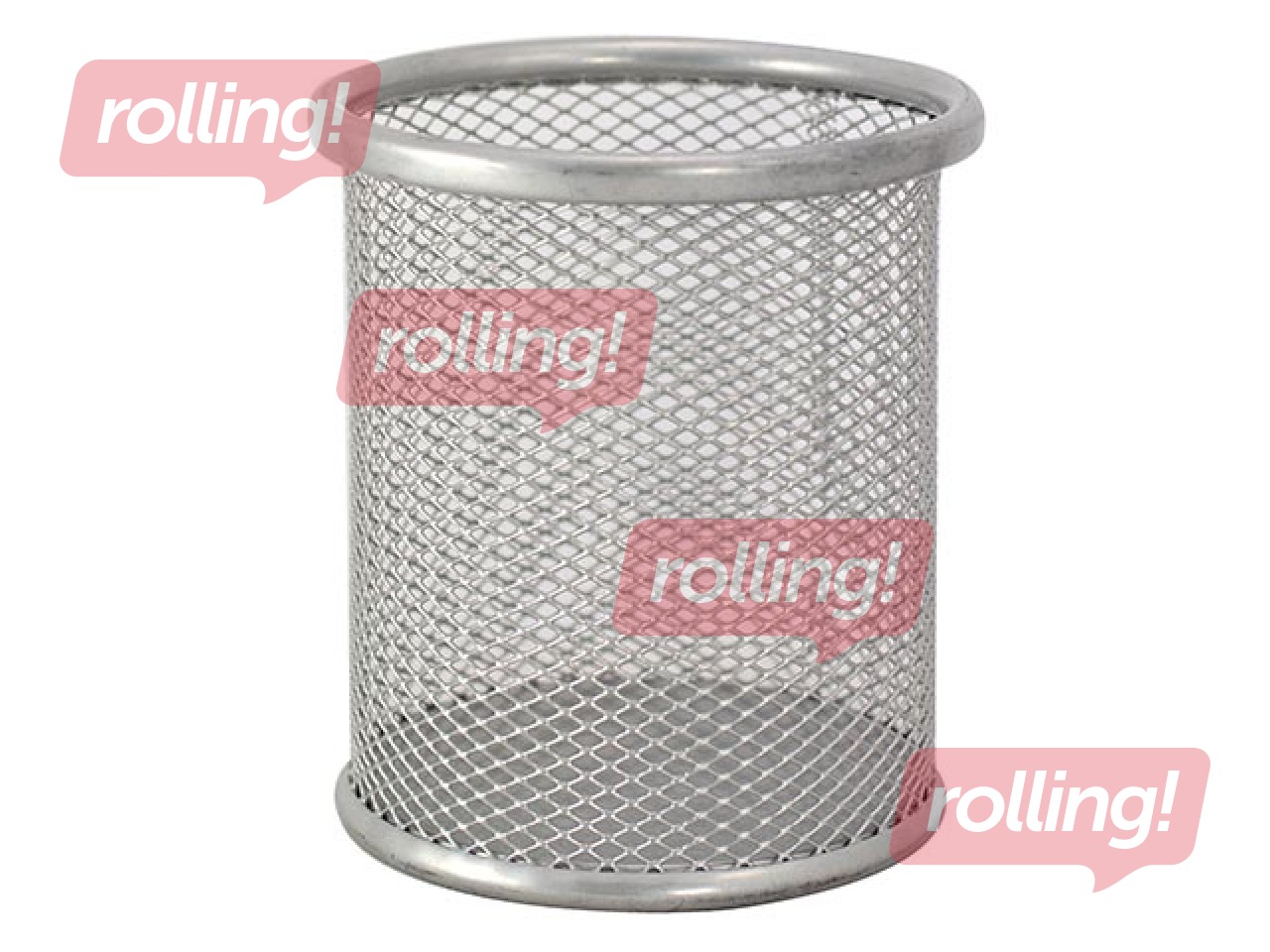 Apaļas formas rakstāmpiederumu trauks, izgatavots no sudrabota sietiņveida metāla. Trauciņa augstums 10 cm.
