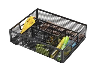 Galda organizators izgatavots no melna sietiņveida metāla.